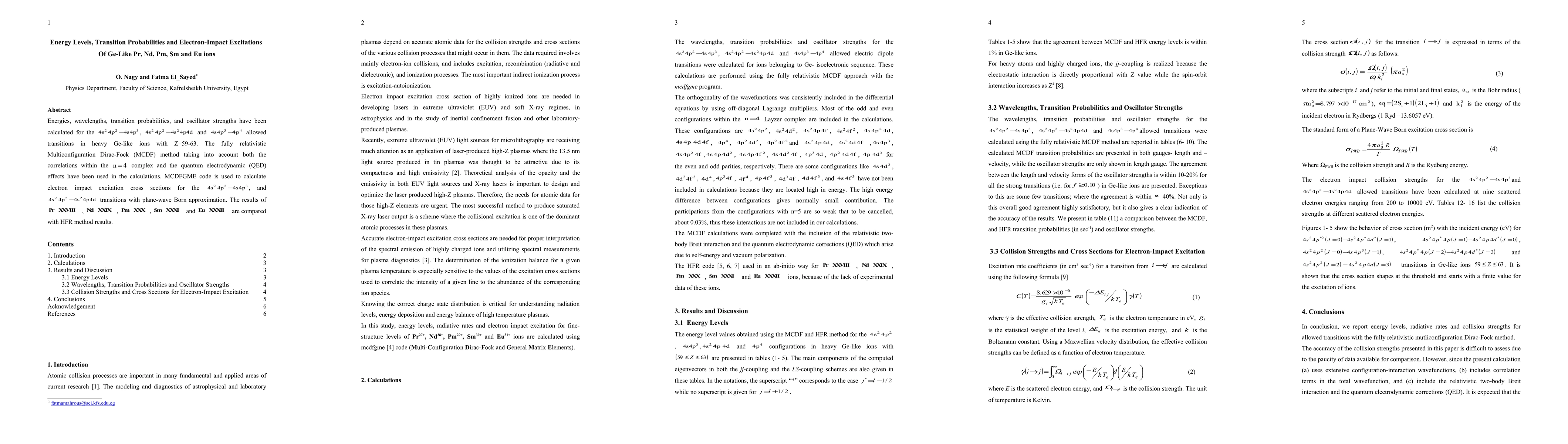 This paper calculates energy levels, transition probabilities, and electron-impact excitations for Ge-like ions of Pr, Nd, Pm, Sm, and Eu using the fully relativistic Multiconfiguration Dirac-Fock method. Results are compared with HFR method findings and include cross sections for specific allowed transitions.