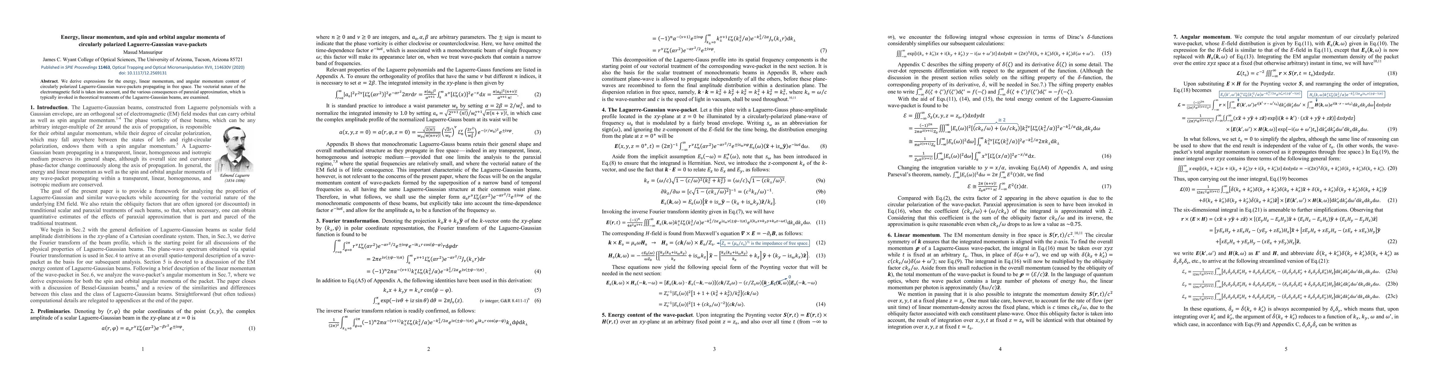 This paper derives expressions for the energy, linear momentum, and angular momentum of circularly polarized Laguerre-Gaussian wave-packets, considering the vectorial nature of the electromagnetic field and examining the effects of the paraxial approximation. The findings provide insights into the propagation characteristics of these wave-packets in free space.