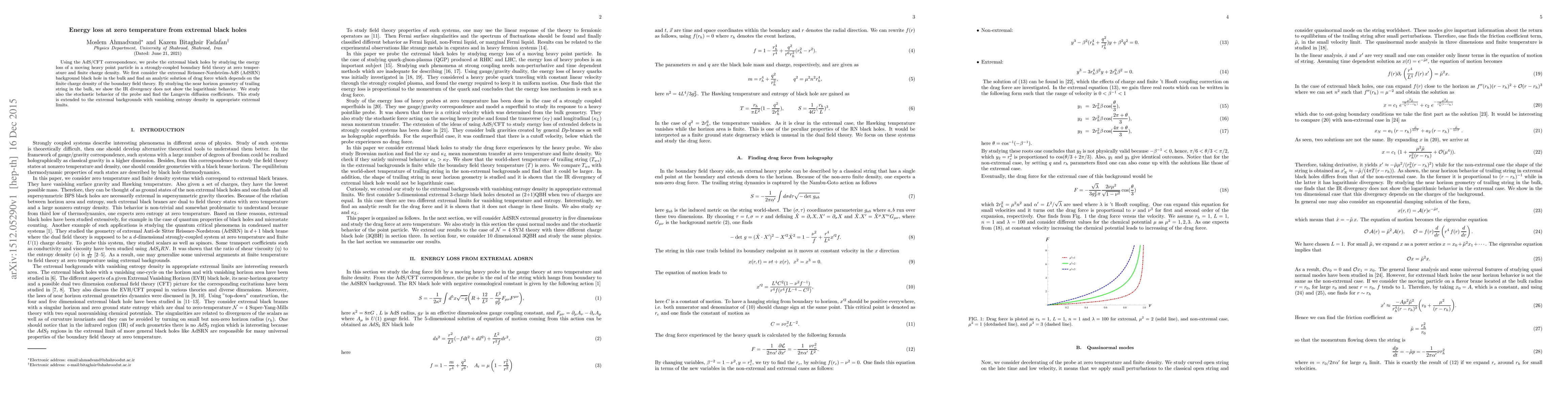 This paper uses the AdS/CFT correspondence to analyze energy loss in extremal black holes by examining the drag force on a moving heavy particle in a strongly-coupled boundary field theory at zero temperature. It finds an analytic solution for the drag force dependent on the boundary field theory's charge density and investigates the near-horizon geometry to show the absence of logarithmic IR divergences.