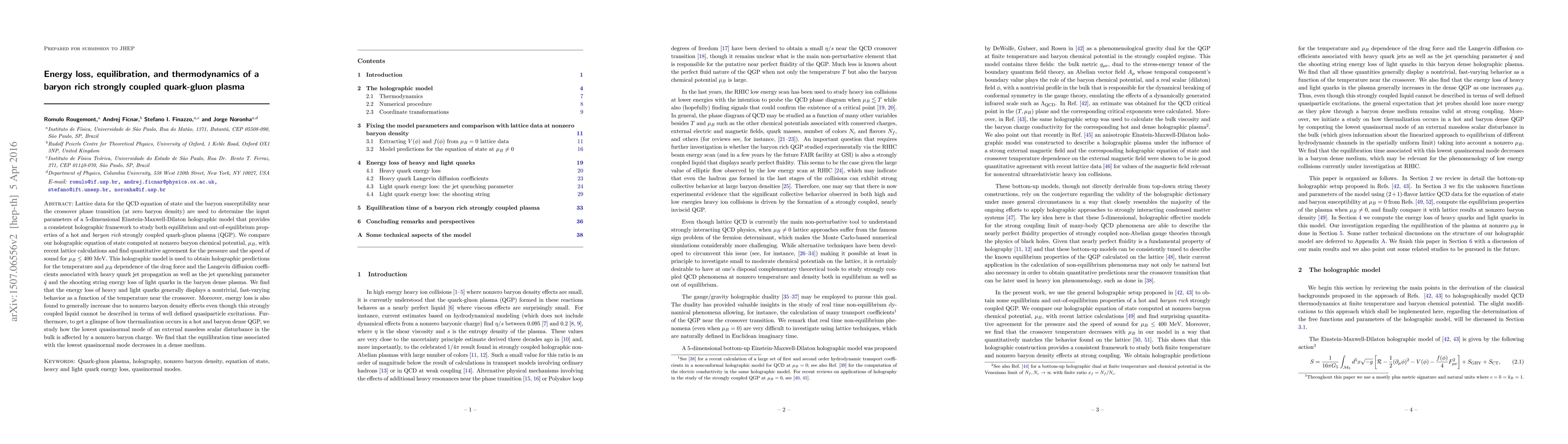 This paper uses a holographic model to study the thermodynamics and energy loss in a baryon-rich, strongly coupled quark-gluon plasma (QGP), finding agreement with lattice calculations for pressure and sound speed. It shows that energy loss varies nontrivially with temperature and increases with baryon density, while equilibration time decreases in dense medium.