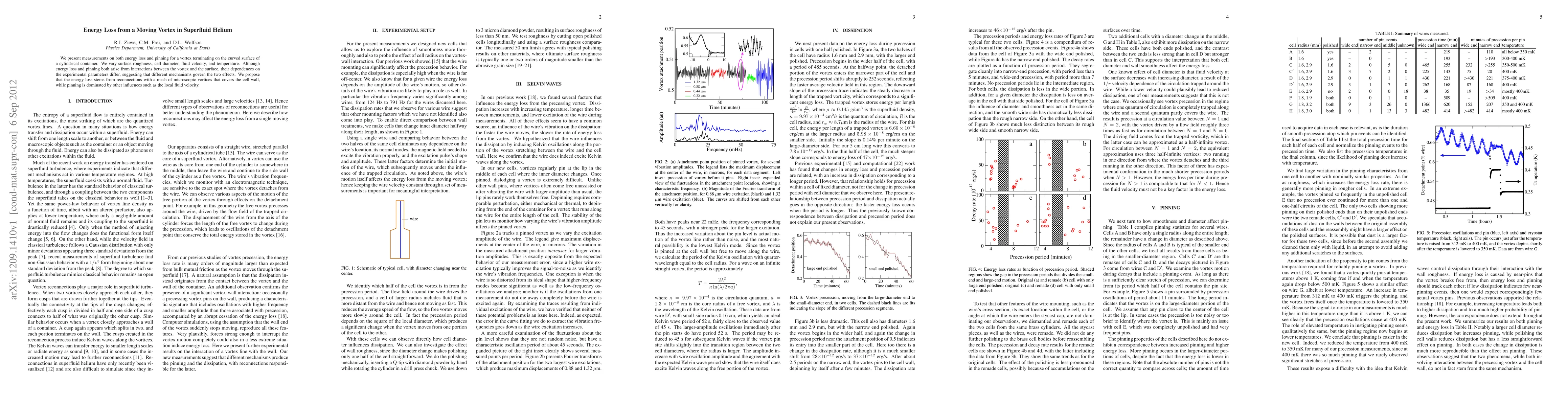We present measurements on both energy loss and pinning for a vortex terminating on the curved surface of a cylindrical container. We vary surface roughness, cell diameter, fluid velocity, and temperature. Although energy loss and pinning both arise from interactions between the vortex and the surface, their dependences on the experimental parameters differ, suggesting that different mechanisms govern the two effects. We propose that the energy loss stems from reconnections with a mesh of microscopic vortices that covers the cell wall, while pinning is dominated by other influences such as the local fluid velocity.