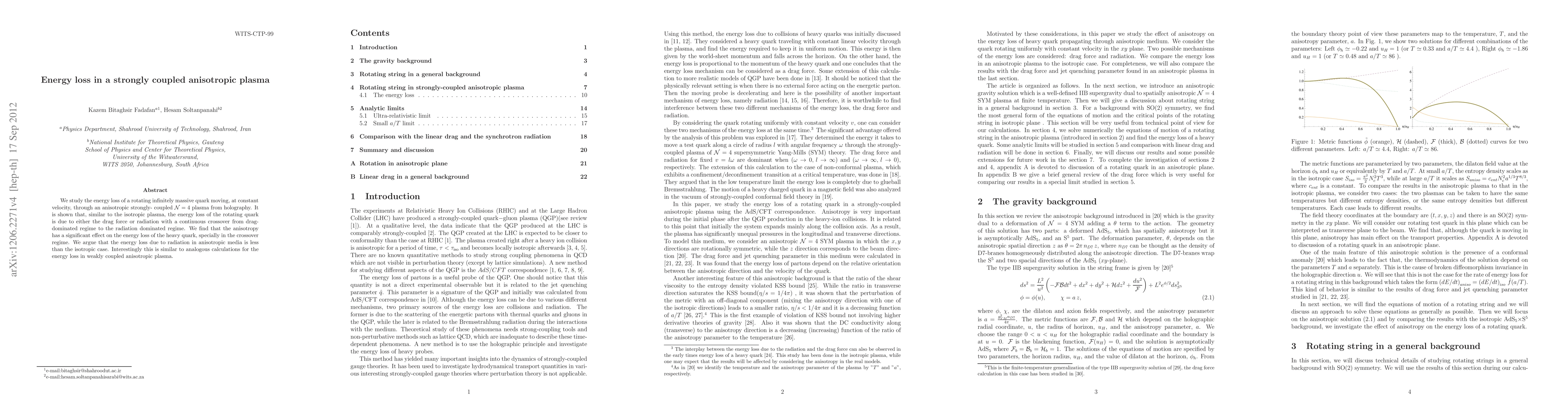 This study investigates the energy loss of a rotating quark moving through an anisotropic, strongly-coupled N=4 plasma, revealing a crossover from drag-dominated to radiation-dominated regimes. The anisotropy significantly affects the energy loss, particularly in the crossover regime, with radiation-induced loss being less in anisotropic compared to isotropic plasmas.