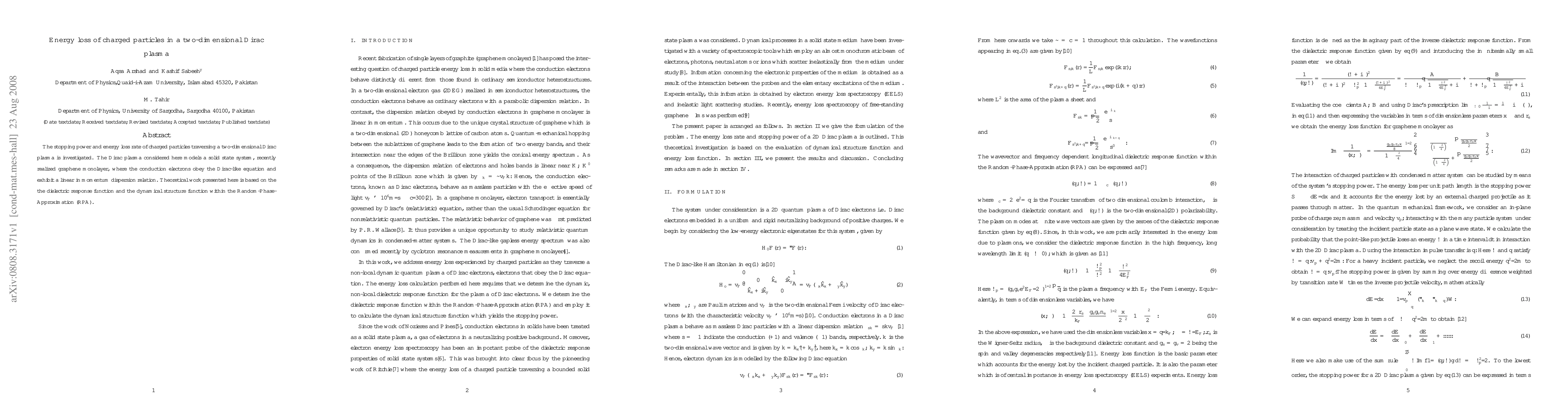 This paper investigates the energy loss mechanisms of charged particles moving through a two-dimensional Dirac plasma, specifically modeled after graphene, using the dielectric response function and Random-Phase-Approximation to determine the stopping power and energy loss rate.