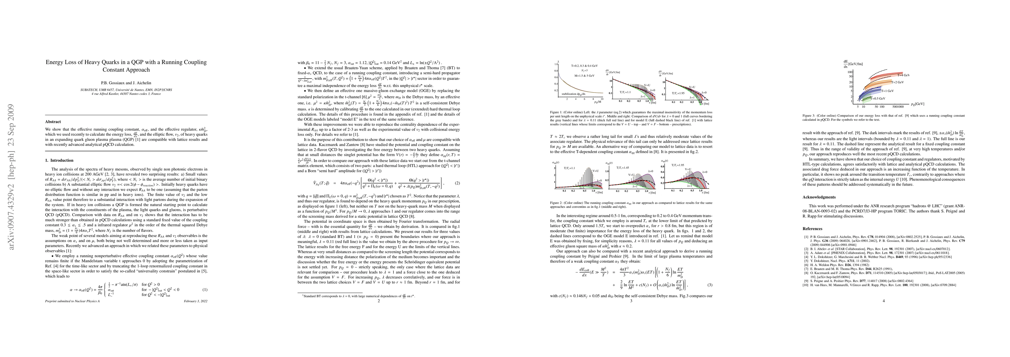 We show that the effective running coupling constant, $\alpha_{\rm eff}$, and the effective regulator, $\kappa \tilde{m}_{D}^2$, which we used recently to calculate the energy loss, $\frac{dE}{dx}$, and the elliptic flow, $v_2$, of heavy quarks in an expanding quark gluon plasma plasma (QGP) are compatible with lattice results and with recently advanced analytical pQCD calculation.