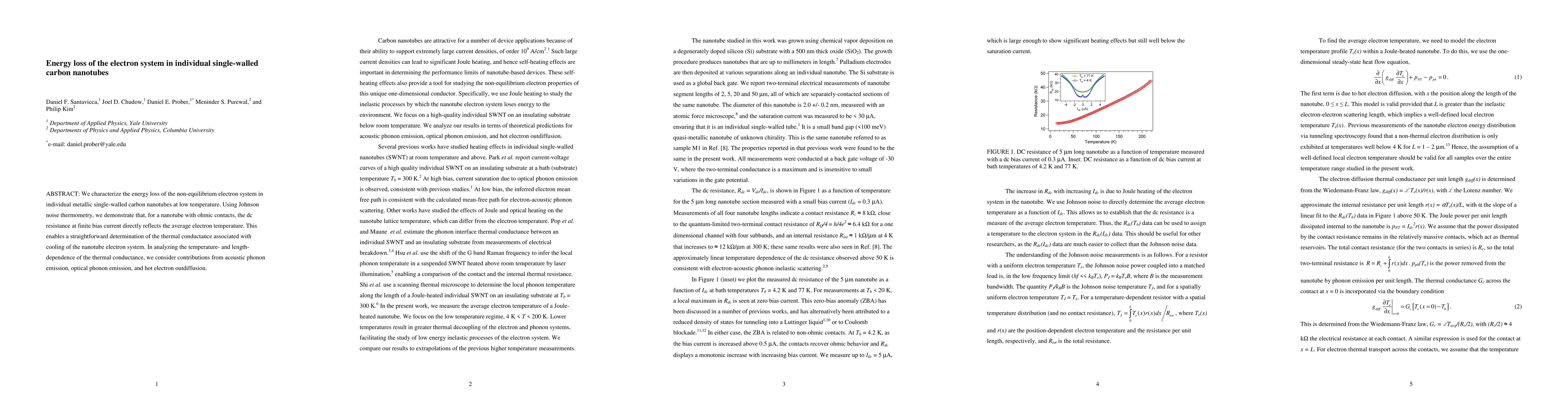 This study investigates the energy loss mechanisms in metallic single-walled carbon nanotubes using Johnson noise thermometry, revealing the direct correlation between dc resistance and electron temperature, and identifies thermal conductance contributions from acoustic and optical phonon emissions and hot electron outdiffusion.