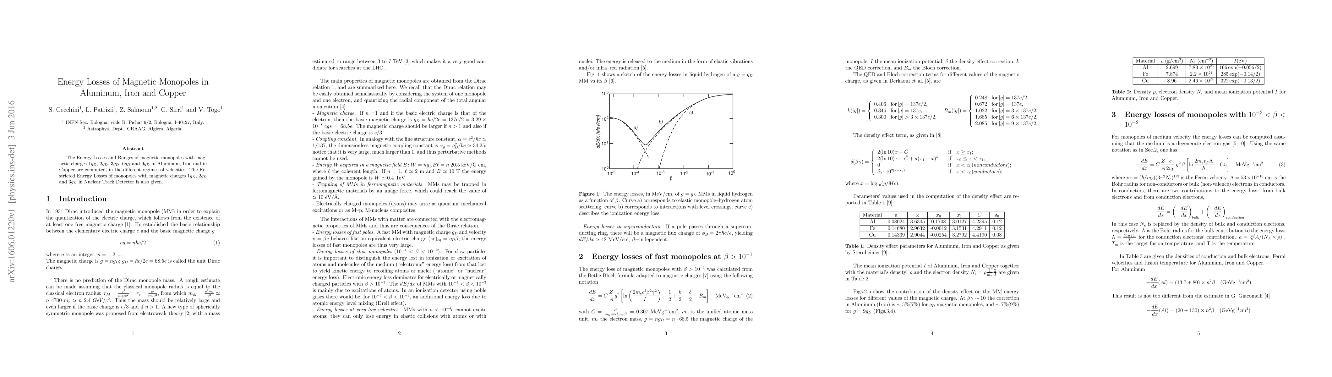 The Energy Losses and Ranges of magnetic monopoles with magnetic charges $1g_{D}$, $2g_{D}$, $3g_{D}$, $6g_{D}$ and $9g_{D}$ in Aluminum, Iron and in Copper are computed, in the different regimes of velocities. The Restricted Energy Losses of monopoles with magnetic charges $1g_{D}$, $2g_{D}$ and $3g_{D}$ in Nuclear Track Detector is also given.