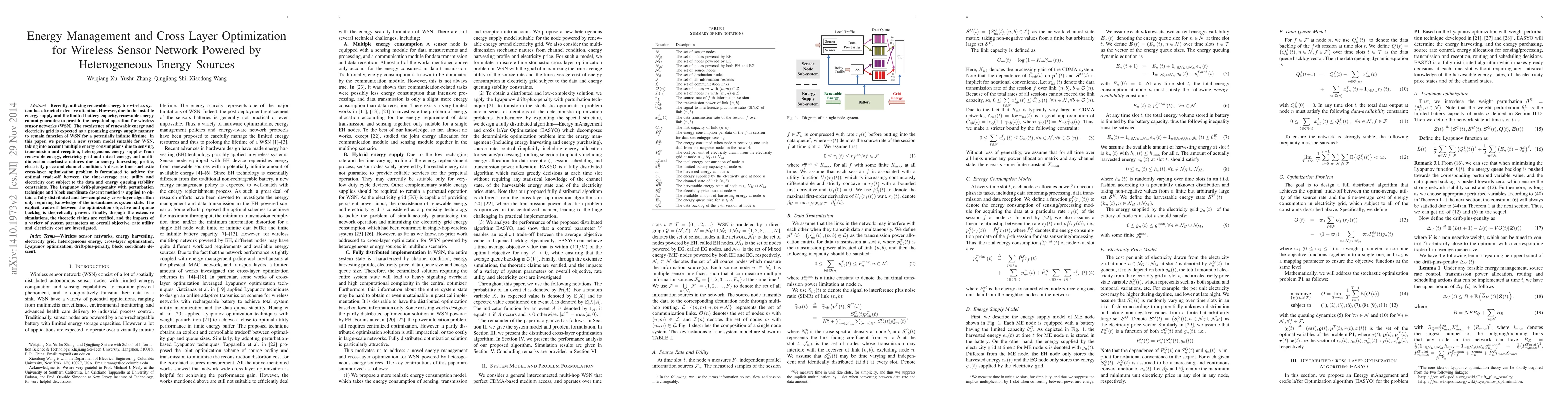 This paper proposes a system model for wireless sensor networks powered by heterogeneous energy sources, including renewable energy and the electricity grid. It formulates a cross-layer optimization problem to balance data rate utility and electricity cost, using a distributed algorithm based on Lyapunov drift and block coordinate descent.