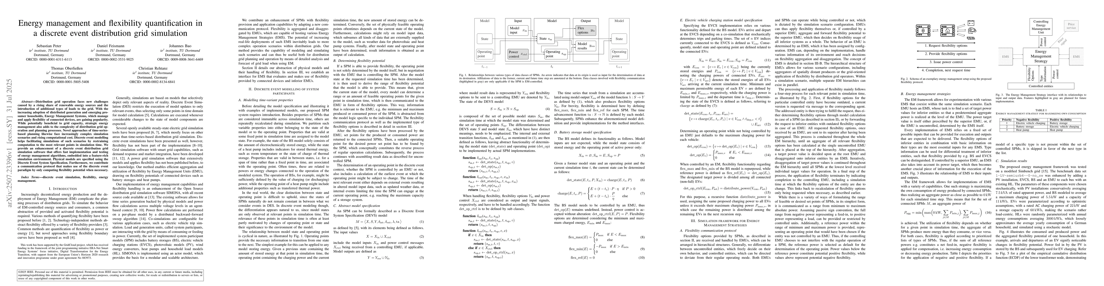 Distribution grid operation faces new challenges caused by a rising share of renewable energy sources and the introduction of additional types of loads to the grid. With the increasing adoption of distributed generation and emerging prosumer households, Energy Management Systems, which manage and apply flexibility of connected devices, are gaining popularity. While potentially beneficial to grid capacity, strategic energy management also adds to the complexity of distribution grid operation and planning processes. Novel approaches of time-series-based planning likewise face increasingly complex simulation scenarios and rising computational cost. Discrete event modelling helps facilitating simulations of such scenarios by restraining computation to the most relevant points in simulation time. We provide an enhancement of a discrete event distribution grid simulation software that offers fast implementation and testing of energy management algorithms, embedded into a feature-rich simulation environment. Physical models are specified using the Discrete Event System Specification. Furthermore, we contribute a communication protocol that makes use of the discrete event paradigm by only computing flexibility potential when necessary.