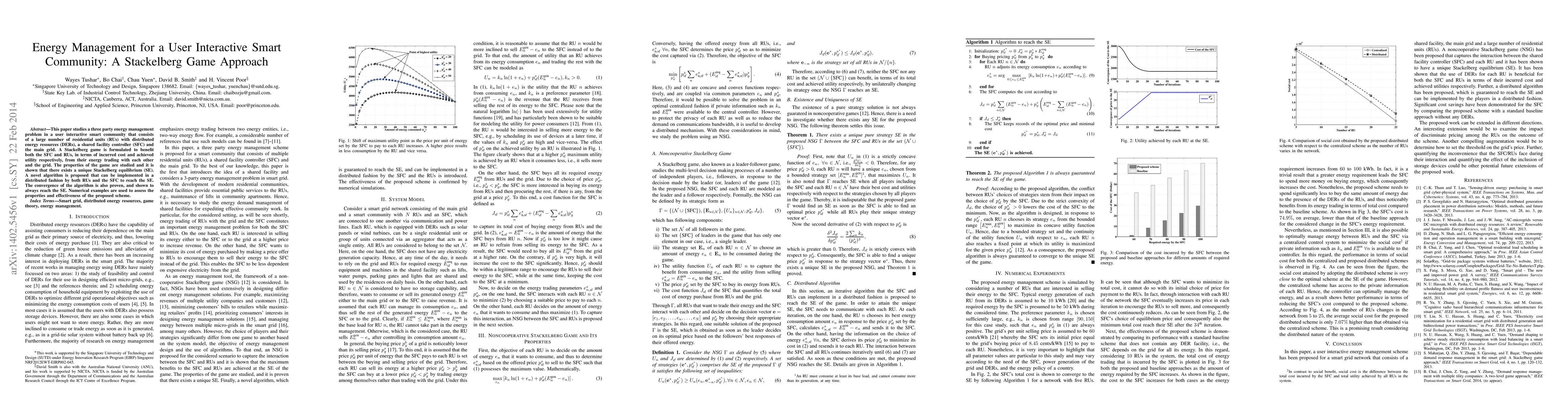 This paper proposes a Stackelberg game approach to manage energy in a smart community involving residential units, a shared facility controller, and the main grid. It demonstrates a unique Stackelberg equilibrium and presents a distributed algorithm that ensures convergence to this equilibrium, validated through numerical examples.