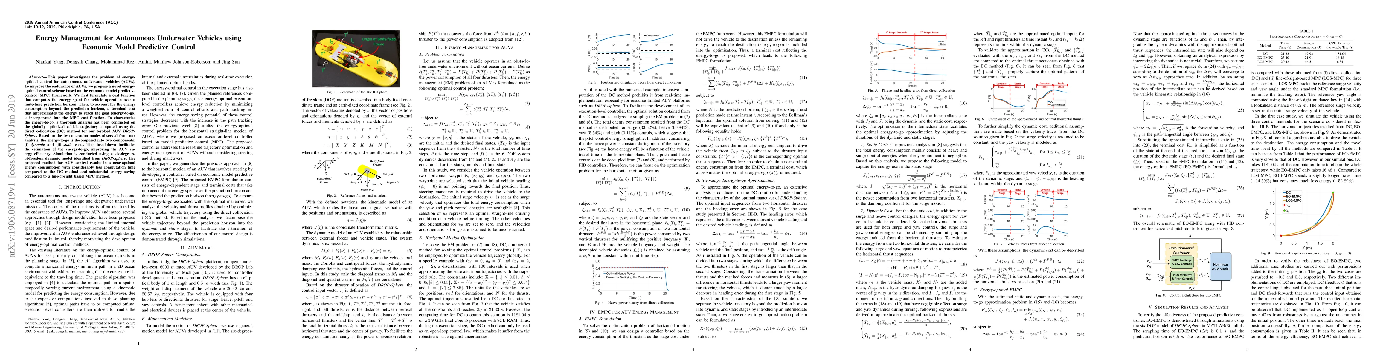 This paper proposes an energy-optimal control scheme for autonomous underwater vehicles (AUVs) using economic model predictive control (MPC). The approach formulates a cost function to minimize energy consumption over a prediction horizon and includes a terminal cost to account for energy-to-go beyond the horizon.