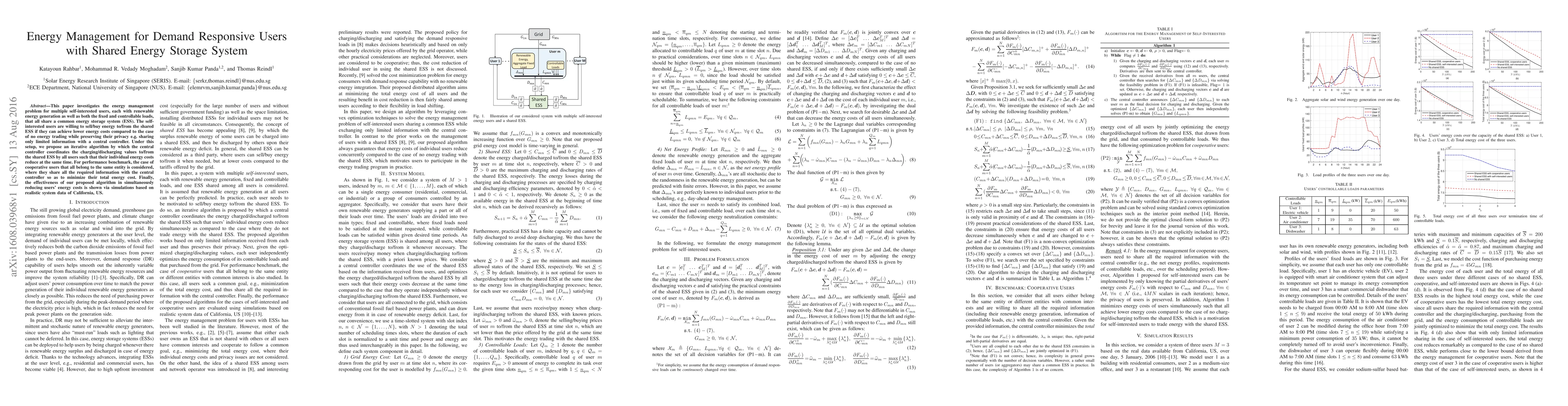This paper investigates the energy management problem for multiple self-interested users, each with renewable energy generation as well as both the fixed and controllable loads, that all share a common energy storage system (ESS). The self-interested users are willing to sell/buy energy to/from the shared ESS if they can achieve lower energy costs compared to the case of no energy trading while preserving their privacy e.g. sharing only limited information with a central controller. Under this setup, we propose an iterative algorithm by which the central controller coordinates the charging/discharging values to/from the shared ESS by all users such that their individual energy costs reduce at the same time. For performance benchmark, the case of cooperative users that all belong to the same entity is considered, where they share all the required information with the central controller so as to minimize their total energy cost. Finally, the effectiveness of our proposed algorithm in simultaneously reducing users' energy costs is shown via simulations based on realistic system data of California, US.