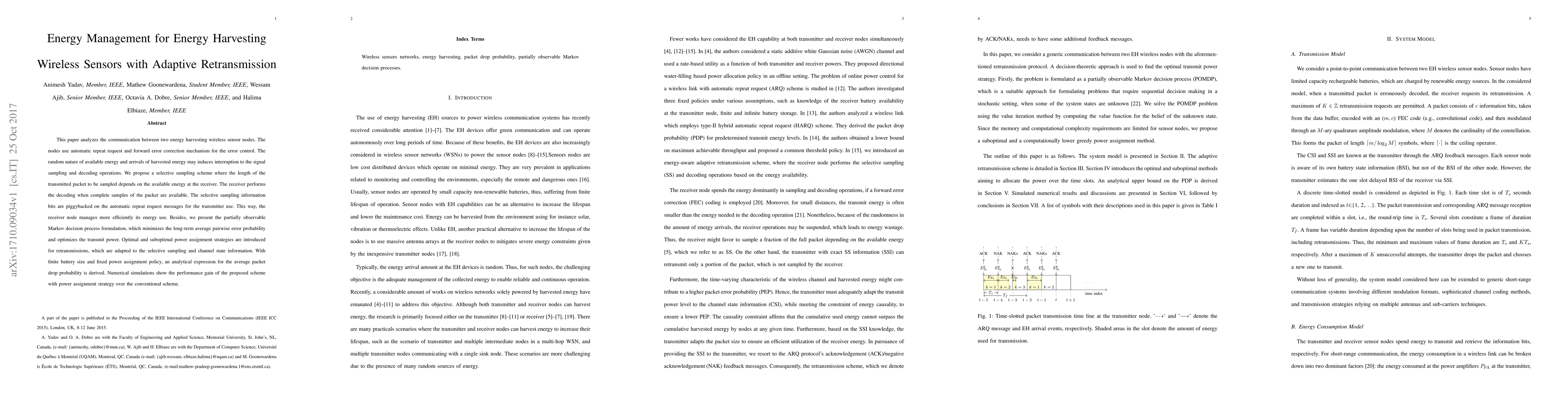 This paper proposes an adaptive energy management strategy for energy harvesting wireless sensor nodes, utilizing selective sampling and adaptive retransmission to optimize energy use and minimize error probability. The approach employs a partially observable Markov decision process to determine optimal transmit power and packet sampling length based on available energy, leading to improved performance over conventional methods.