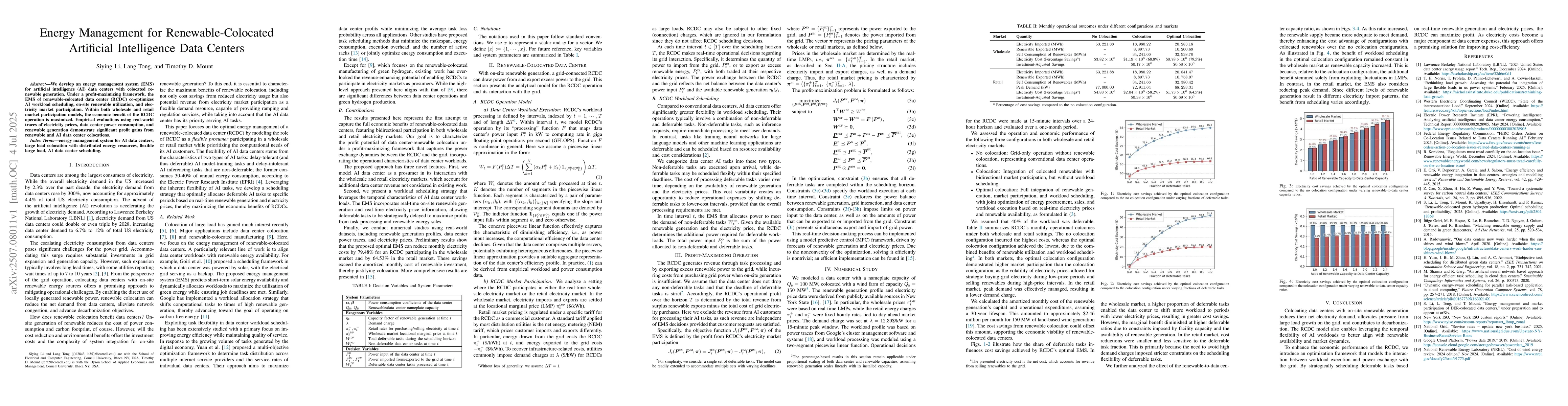 We develop an energy management system (EMS) for artificial intelligence (AI) data centers with colocated renewable generation. Under a profit-maximizing framework, the EMS of renewable-colocated data center (RCDC) co-optimizes AI workload scheduling, on-site renewable utilization, and electricity market participation. Within both wholesale and retail market participation models, the economic benefit of the RCDC operation is maximized. Empirical evaluations using real-world traces of electricity prices, data center power consumption, and renewable generation demonstrate significant profit gains from renewable and AI data center colocations.