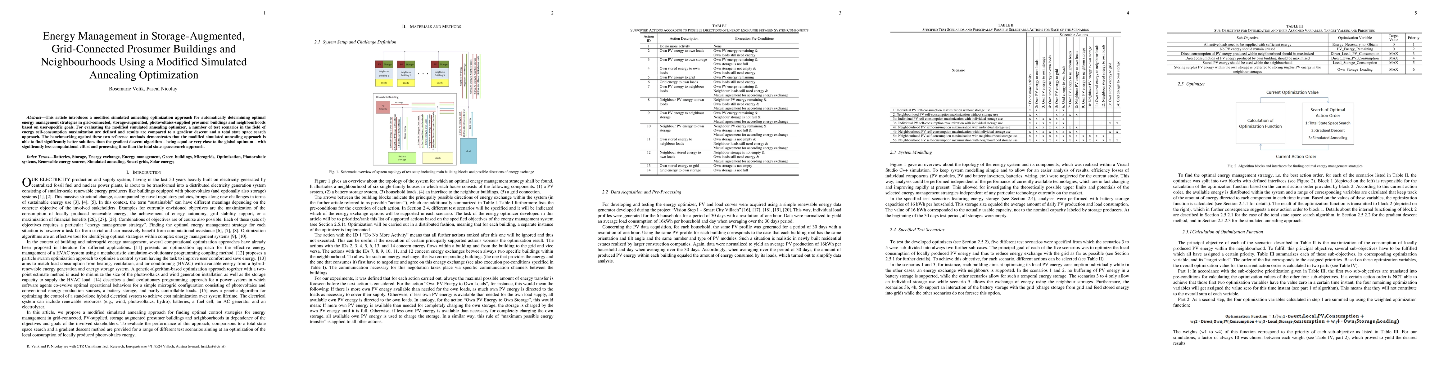 This paper proposes a modified simulated annealing optimization method for optimizing energy management in grid-connected, storage-augmented prosumer buildings and neighborhoods, achieving better energy self-consumption maximization compared to gradient descent and total state space search methods with lower computational costs.
