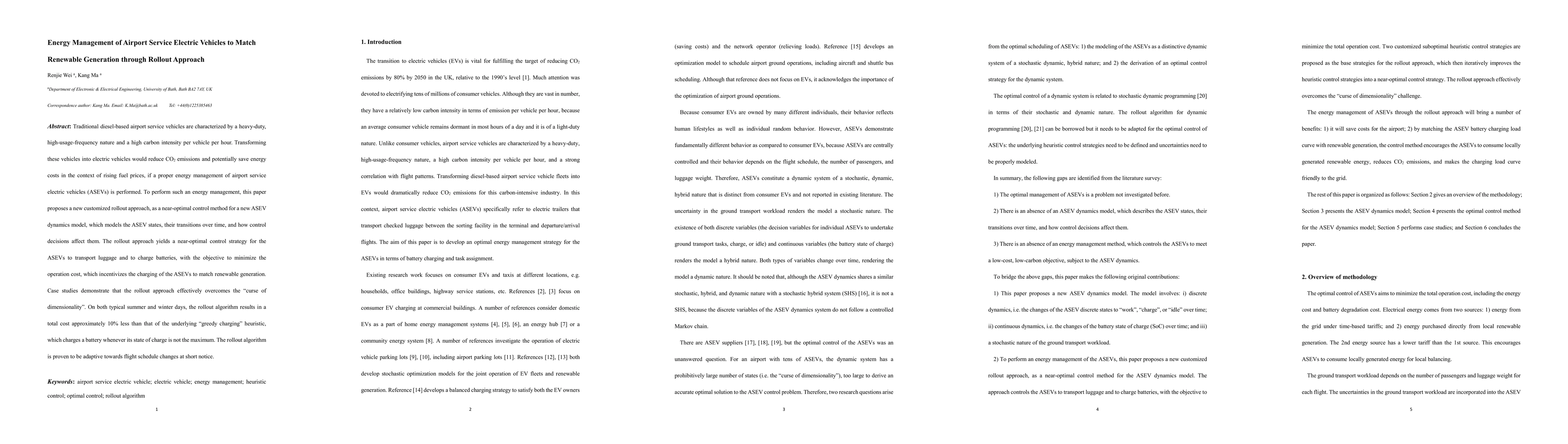 This paper proposes a customized rollout approach to manage energy for airport service electric vehicles (ASEVs) to align charging with renewable energy generation, aiming to reduce operational costs and CO2 emissions. The rollout method outperforms a greedy charging heuristic, achieving a 10% lower total cost and demonstrating adaptability to flight schedule changes.