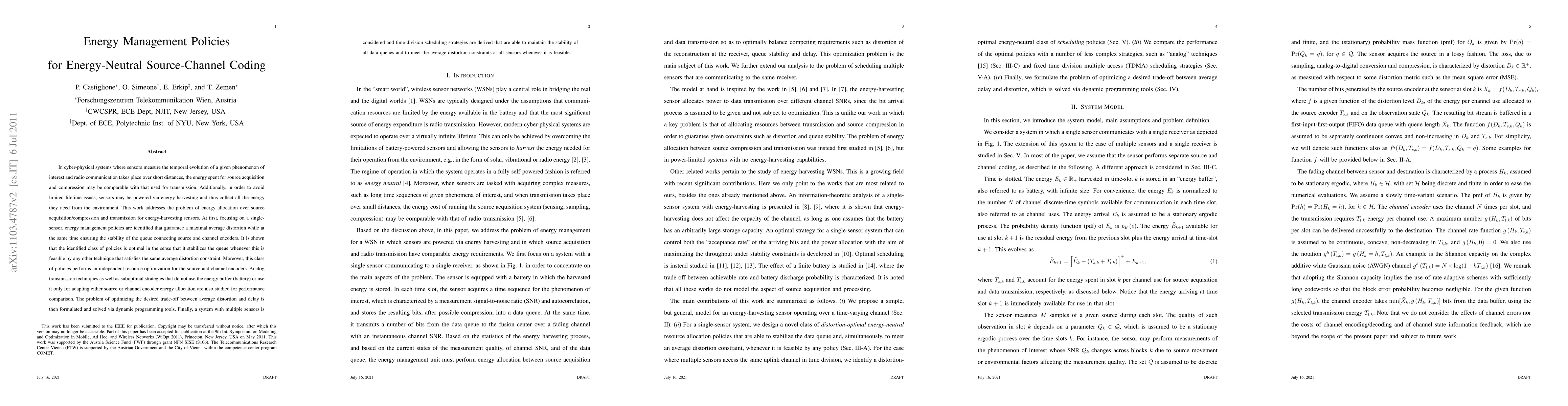 In cyber-physical systems where sensors measure the temporal evolution of a given phenomenon of interest and radio communication takes place over short distances, the energy spent for source acquisition and compression may be comparable with that used for transmission. Additionally, in order to avoid limited lifetime issues, sensors may be powered via energy harvesting and thus collect all the energy they need from the environment. This work addresses the problem of energy allocation over source acquisition/compression and transmission for energy-harvesting sensors. At first, focusing on a single-sensor, energy management policies are identified that guarantee a maximal average distortion while at the same time ensuring the stability of the queue connecting source and channel encoders. It is shown that the identified class of policies is optimal in the sense that it stabilizes the queue whenever this is feasible by any other technique that satisfies the same average distortion constraint. Moreover, this class of policies performs an independent resource optimization for the source and channel encoders. Analog transmission techniques as well as suboptimal strategies that do not use the energy buffer (battery) or use it only for adapting either source or channel encoder energy allocation are also studied for performance comparison. The problem of optimizing the desired trade-off between average distortion and delay is then formulated and solved via dynamic programming tools. Finally, a system with multiple sensors is considered and time-division scheduling strategies are derived that are able to maintain the stability of all data queues and to meet the average distortion constraints at all sensors whenever it is feasible.