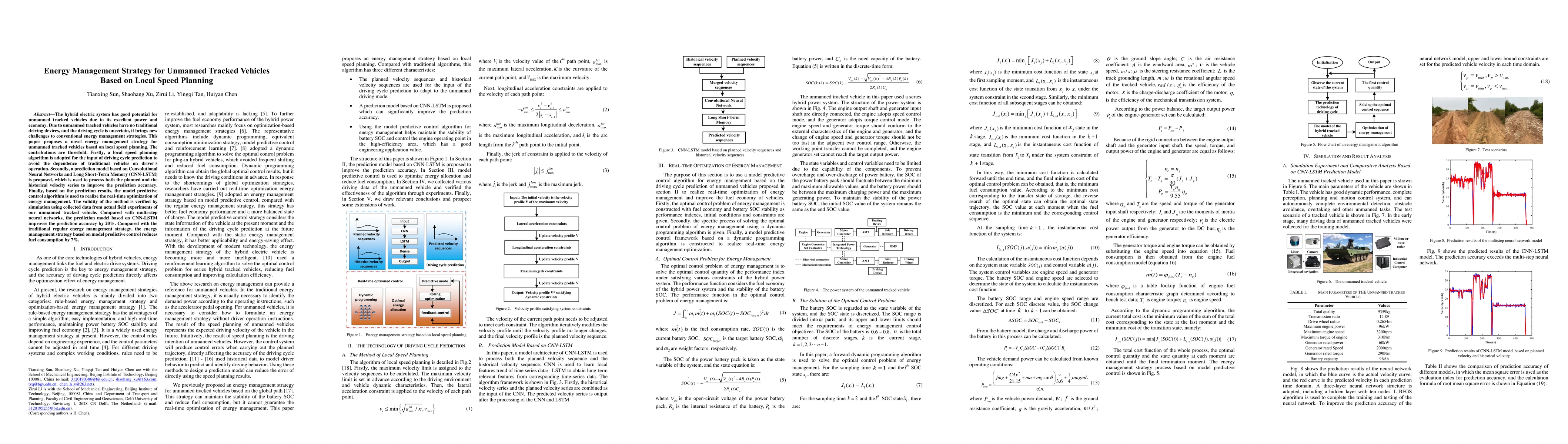 This paper proposes an innovative energy management strategy for unmanned tracked vehicles, utilizing a local speed planning algorithm and a CNN-LSTM prediction model to enhance driving cycle prediction accuracy. The model predictive control algorithm optimizes energy management, reducing fuel consumption by 7% compared to traditional methods.