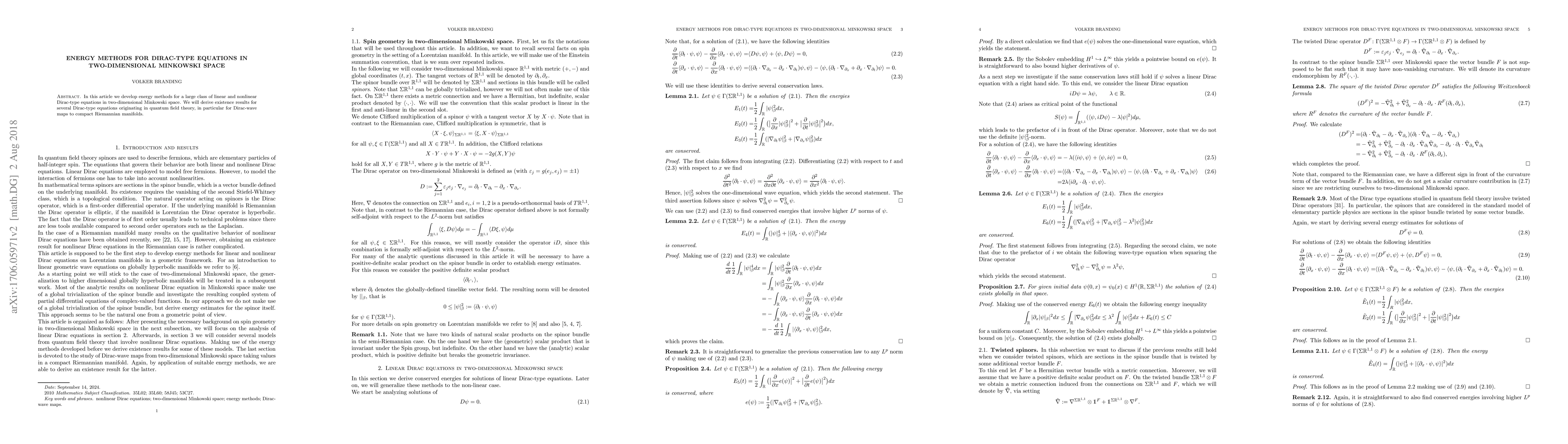 In this article we develop energy methods for a large class of linear and nonlinear Dirac-type equations in two-dimensional Minkowski space. We will derive existence results for several Dirac-type equations originating in quantum field theory, in particular for Dirac-wave maps to compact Riemannian manifolds.