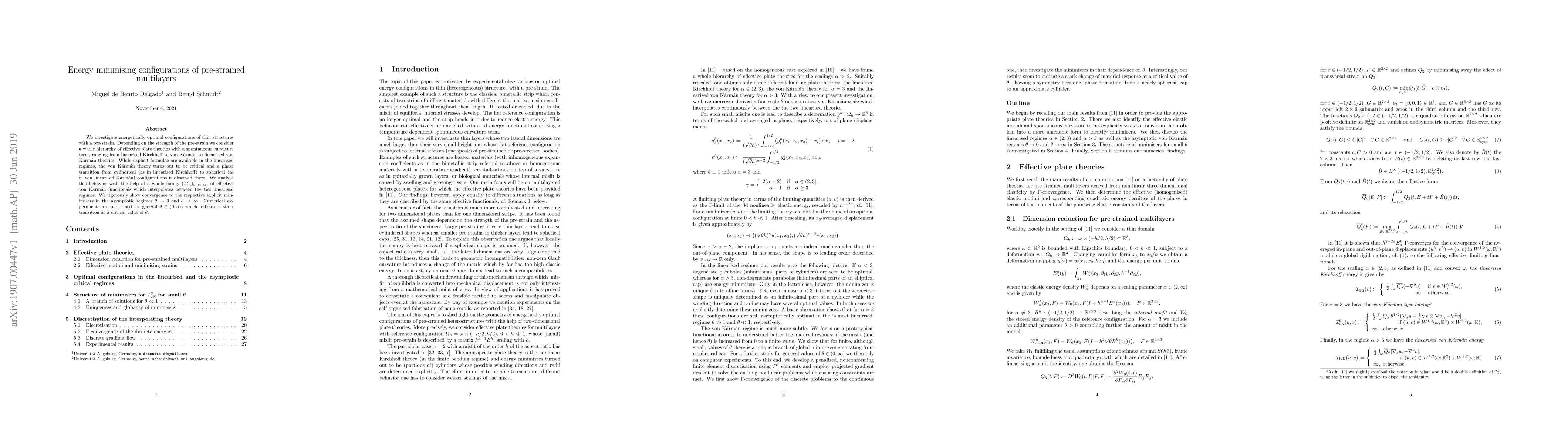 We investigate energetically optimal configurations of thin structures with a pre-strain. Depending on the strength of the pre-strain we consider a whole hierarchy of effective plate theories with a spontaneous curvature term, ranging from linearised Kirchhoff to von K\'arm\'an to linearised von K\'arm\'an theories. While explicit formulae are available in the linearised regimes, the von K\'arm\'an theory turns out to be critical and a phase transition from cylindrical (as in linearised Kirchhoff) to spherical (as in von linearised K\'arm\'an) configurations is observed there. We analyse this behavior with the help of a whole family $(\mathcal{I}^{\theta}_{\rm vK})_{\theta \in (0,\infty)}$ of effective von K\'arm\'an functionals which interpolates between the two linearised regimes. We rigorously show convergence to the respective explicit minimisers in the asymptotic regimes $\theta \to 0$ and $\theta \to \infty$. Numerical experiments are performed for general $\theta \in (0,\infty)$ which indicate a stark transition at a critical value of $\theta$.
