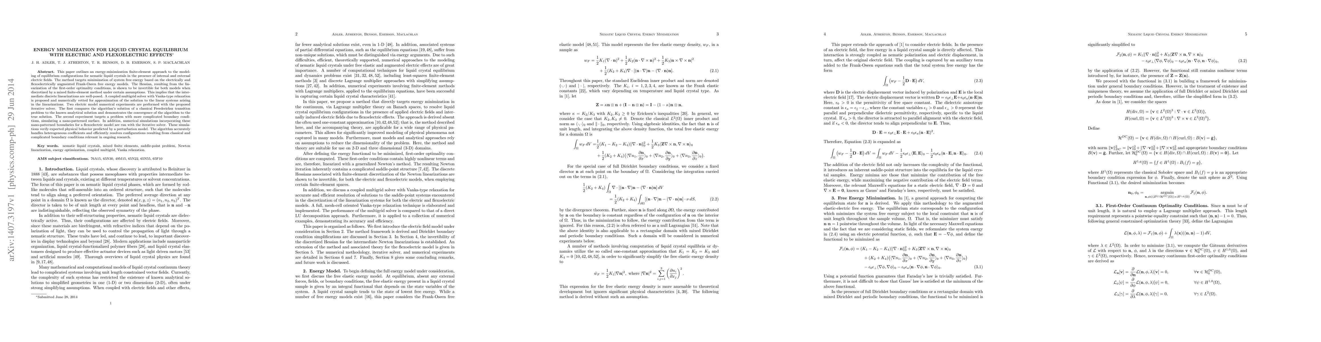 This paper presents an energy-minimization finite-element method for modeling nematic liquid crystals under electric and flexoelectric effects, demonstrating the invertibility of the Hessian for accurate system free energy minimization. Numerical experiments validate the method's effectiveness in solving classical and complex boundary conditions, confirming the algorithm's accuracy and efficiency.