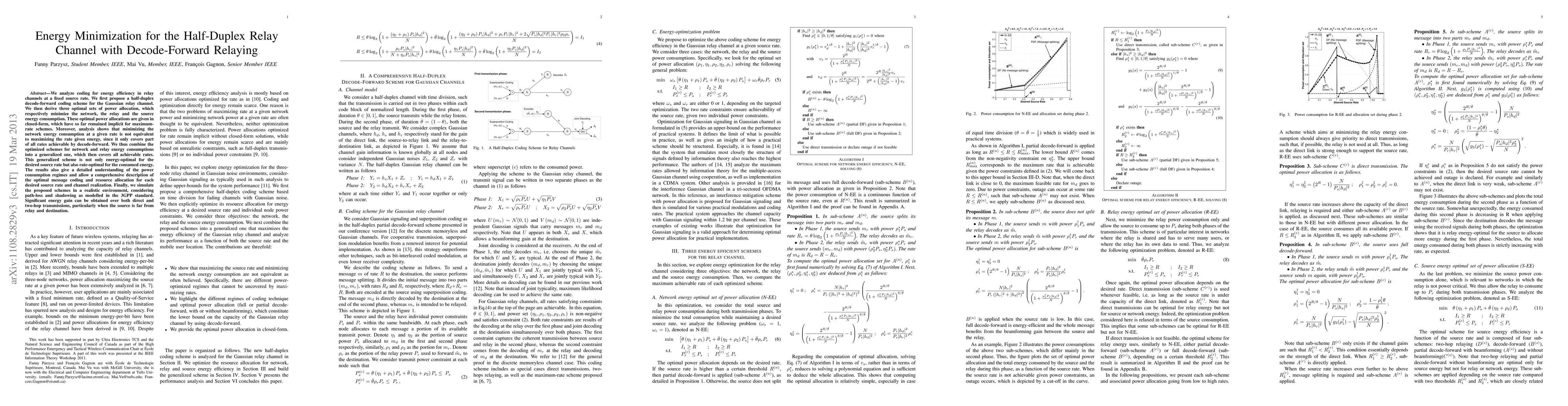 We analyze coding for energy efficiency in relay channels at a fixed source rate. We first propose a half-duplex decode-forward coding scheme for the Gaussian relay channel. We then derive three optimal sets of power allocation, which respectively minimize the network, the relay and the source energy consumption. These optimal power allocations are given in closed-form, which have so far remained implicit for maximum-rate schemes. Moreover, analysis shows that minimizing the network energy consumption at a given rate is not equivalent to maximizing the rate given energy, since it only covers part of all rates achievable by decode-forward. We thus combine the optimized schemes for network and relay energy consumptions into a generalized one, which then covers all achievable rates. This generalized scheme is not only energy-optimal for the desired source rate but also rate-optimal for the consumed energy. The results also give a detailed understanding of the power consumption regimes and allow a comprehensive description of the optimal message coding and resource allocation for each desired source rate and channel realization. Finally, we simulate the proposed schemes in a realistic environment, considering path-loss and shadowing as modelled in the 3GPP standard. Significant energy gain can be obtained over both direct and two-hop transmissions, particularly when the source is far from relay and destination.