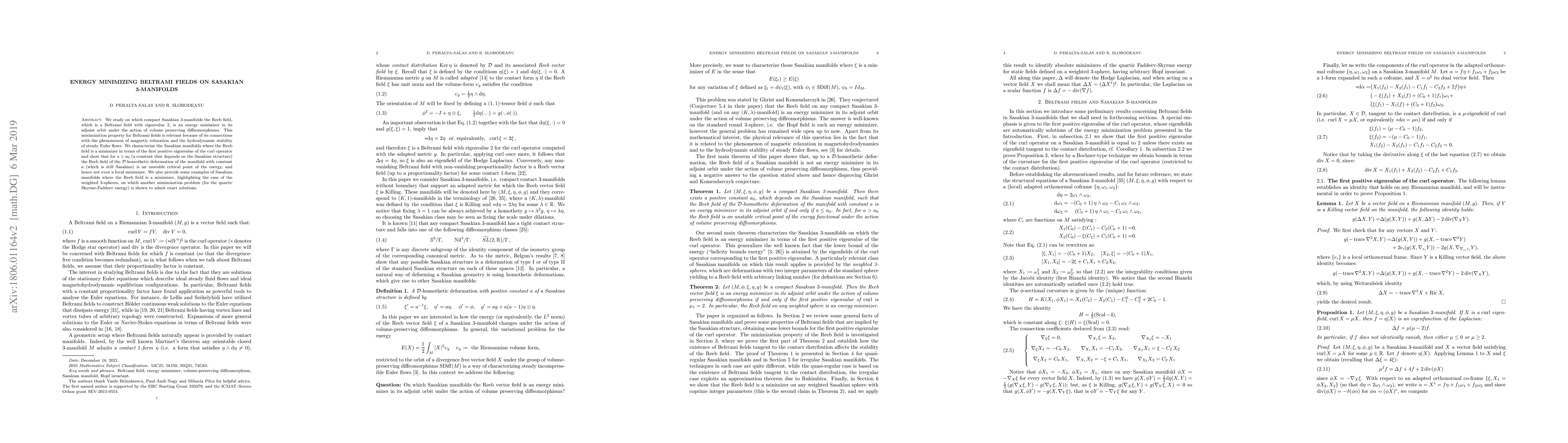 We study on which compact Sasakian 3-manifolds the Reeb field, which is a Beltrami field with eigenvalue 2, is an energy minimizer in its adjoint orbit under the action of volume preserving diffeomorphisms. This minimization property for Beltrami fields is relevant because of its connections with the phenomenon of magnetic relaxation and the hydrodynamic stability of steady Euler flows. We characterize the Sasakian manifolds where the Reeb field is a minimizer in terms of the first positive eigenvalue of the curl operator and show that for $a>a_0$ (a constant that depends on the Sasakian structure) the Reeb field of the $\mathcal{D}$-homothetic deformation of the manifold with constant $a$ (which is still Sasakian) is an unstable critical point of the energy, and hence not even a local minimizer. We also provide some examples of Sasakian manifolds where the Reeb field is a minimizer, highlighting the case of the weighted 3-spheres, on which another minimization problem (for the quartic Skyrme-Faddeev energy) is shown to admit exact solutions.