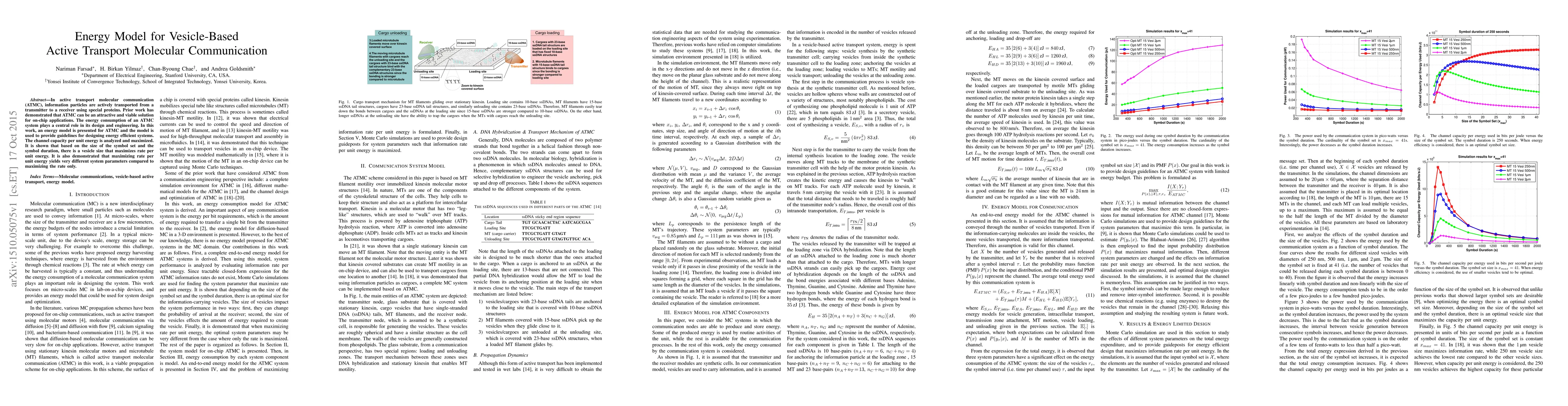 In active transport molecular communication (ATMC), information particles are actively transported from a transmitter to a receiver using special proteins. Prior work has demonstrated that ATMC can be an attractive and viable solution for on-chip applications. The energy consumption of an ATMC system plays a central role in its design and engineering. In this work, an energy model is presented for ATMC and the model is used to provide guidelines for designing energy efficient systems. The channel capacity per unit energy is analyzed and maximized. It is shown that based on the size of the symbol set and the symbol duration, there is a vesicle size that maximizes rate per unit energy. It is also demonstrated that maximizing rate per unit energy yields very different system parameters compared to maximizing the rate only.