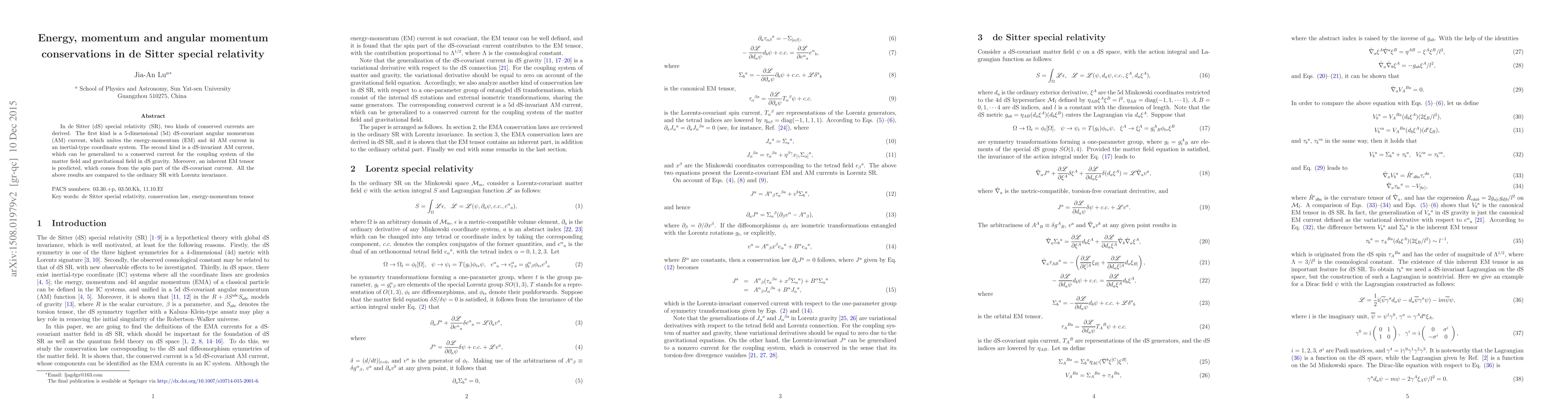 This paper derives two types of conserved currents in de Sitter special relativity: a 5-dimensional dS-covariant angular momentum current that integrates energy-momentum and 4d angular momentum, and a dS-invariant AM current, applicable to coupled matter and gravitational fields. It also predicts an inherent energy-momentum tensor from the spin part of the dS-covariant current, contrasting with ordinary Lorentz-invariant special relativity.