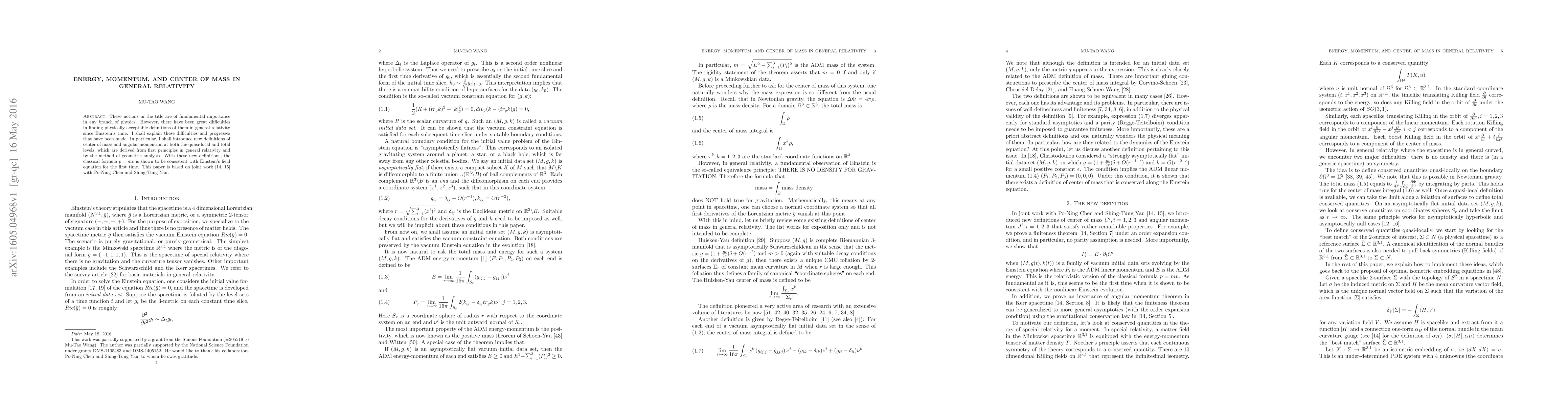 This paper addresses longstanding challenges in defining energy, momentum, and center of mass in general relativity, introducing new quasi-local and total definitions derived from first principles and geometric analysis. These definitions reconcile the classical formula p=mv with Einstein's field equations for the first time, based on collaborative work with Po-Ning Chen and Shing-Tung Yau.