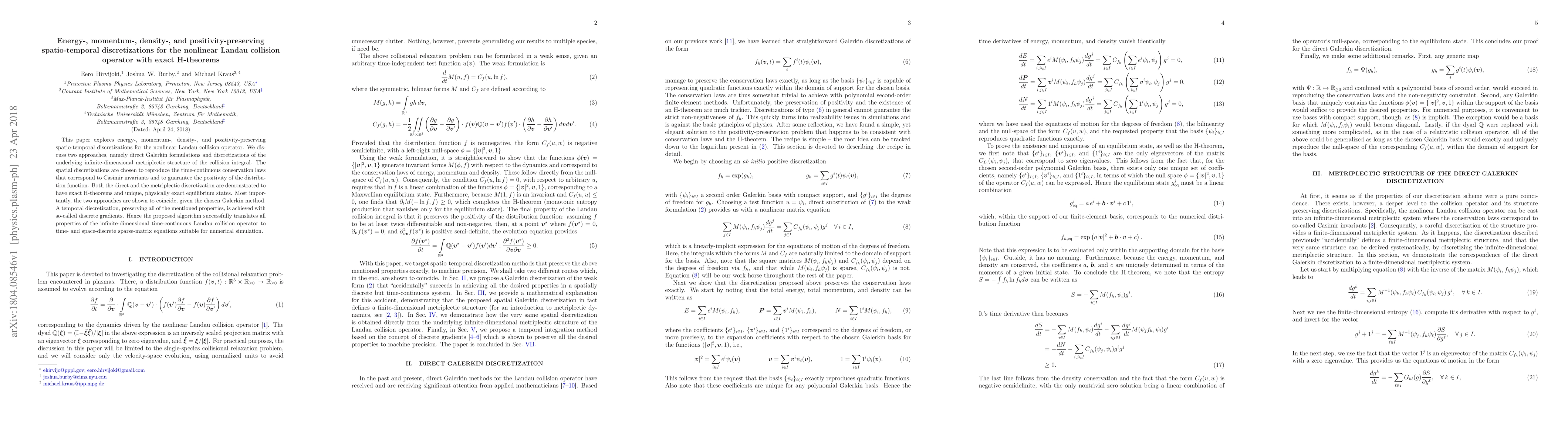 This paper develops energy-, momentum-, density-, and positivity-preserving spatio-temporal discretizations for the nonlinear Landau collision operator, demonstrating exact H-theorems and unique equilibrium states. Both direct Galerkin methods and metriplectic structure discretizations are shown to coincide, with discrete gradients ensuring temporal preservation of properties.
