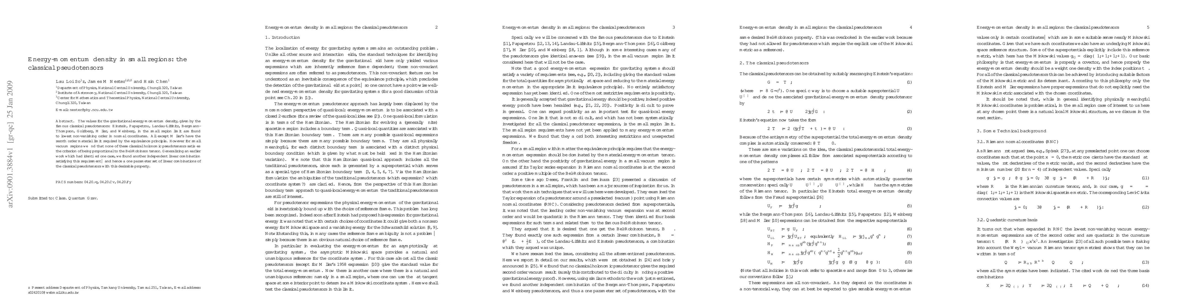 The values for the gravitational energy-momentum density, given by the famous classical pseudotensors: Einstein, Papapetrou, Landau-Lifshitz, Bergmann-Thompson, Goldberg, M{\o}ller, and Weinberg, in the small region limit are found to lowest non-vanishing order in normal coordinates. All except M{\o}ller's have the zeroth order material limit required by the equivalence principle. However for small vacuum regions we find that {\it none} of these classical holonomic pseudotensors satisfies the criterion of being proportional to the Bel-Robinson tensor. Generalizing an earlier work which had identified one case, we found another independent linear combination satisfying this requirement--and hence a one parameter set of linear combinations of the classical pseudotensors with this desirable property.