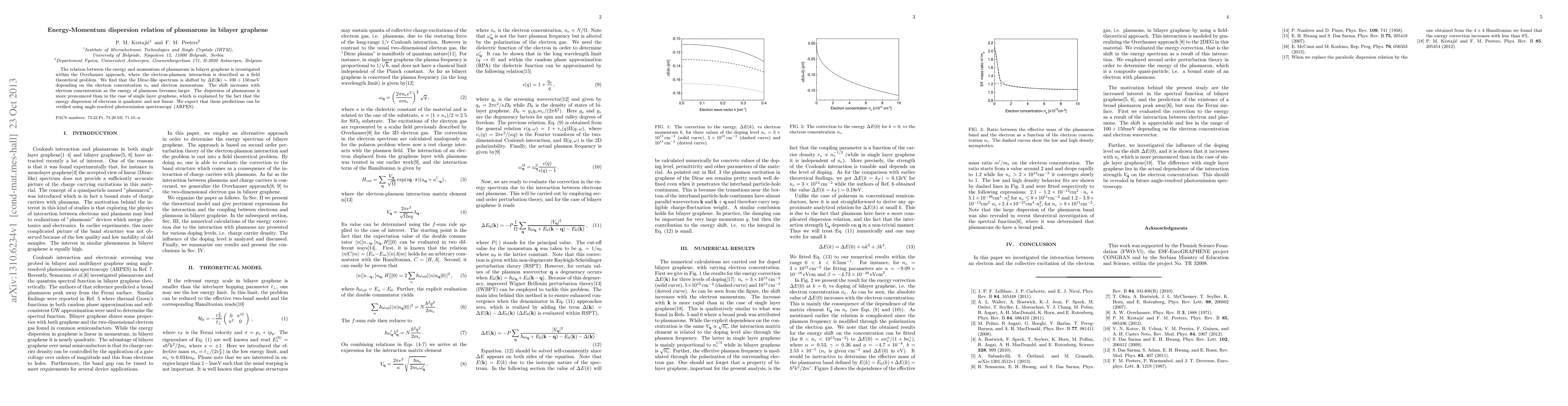 This study investigates the energy-momentum dispersion relation of plasmarons in bilayer graphene using the Overhauser approach, revealing a Dirac-like spectrum shifted by 100-150 meV, which increases with electron concentration. The dispersion is more pronounced than in single-layer graphene due to the quadratic electron energy dispersion.