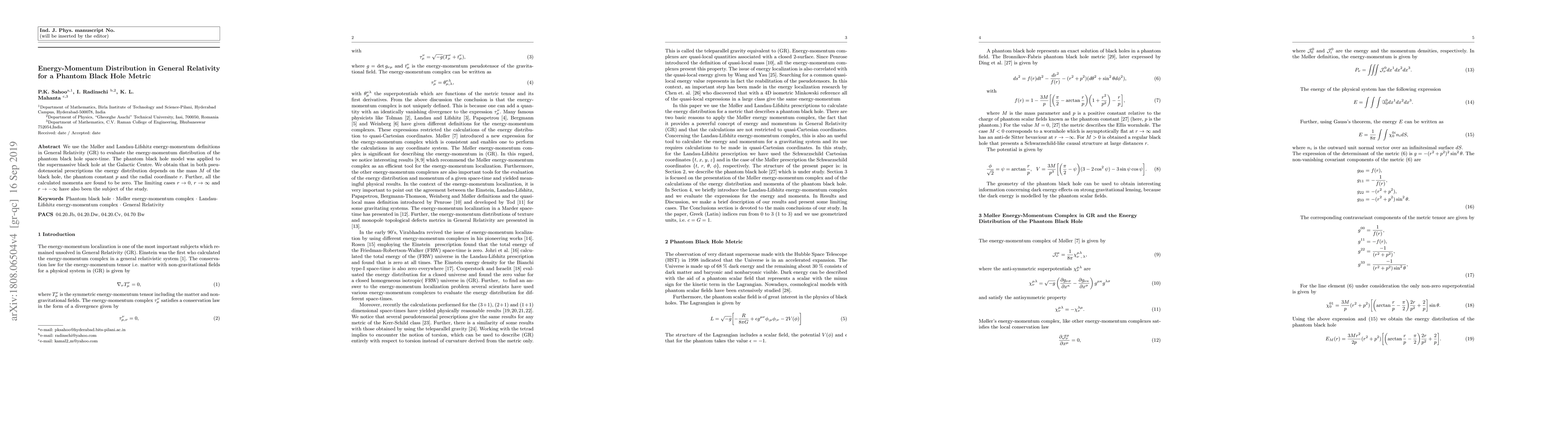 We use the M{\o}ller and Landau-Lifshitz energy-momentum definitions in General Relativity (GR) to evaluate the energy-momentum distribution of the phantom black hole space-time. The phantom black hole model was applied to the supermassive black hole at the Galactic Centre. We obtain that in both pseudotensorial prescriptions the energy distribution depends on the mass $M$ of the black hole, the phantom constant $p$ and the radial coordinate $r$. Further, all the calculated momenta are found to be zero. The limiting cases $r\rightarrow 0$, $r\rightarrow \infty $ and $r\rightarrow -\infty $ have also been the subject of the study.