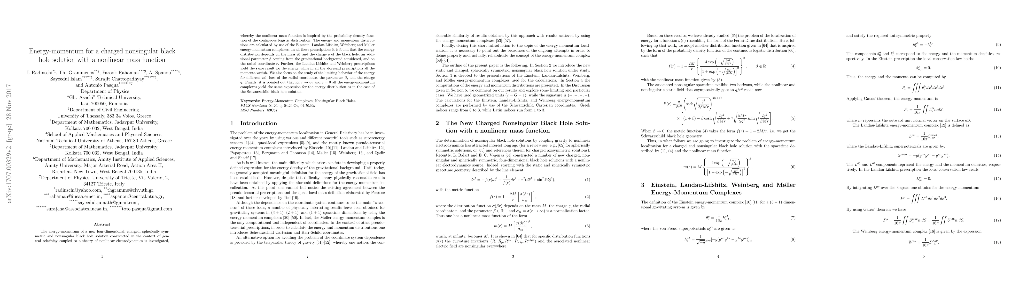 The energy-momentum of a new four-dimensional, charged, spherically symmetric and nonsingular black hole solution constructed in the context of general relativity coupled to a theory of nonlinear electrodynamics is investigated, whereby the nonlinear mass function is inspired by the probability density function of the continuous logistic distribution. The energy and momentum distributions are calculated by use of the Einstein, Landau-Lifshitz, Weinberg and M{\o}ller energy-momentum complexes. In all these prescriptions it is found that the energy distribution depends on the mass $M$ and the charge $q$ of the black hole, an additional parameter $\beta$ coming from the gravitational background considered, and on the radial coordinate $r$. Further, the Landau-Lifshitz and Weinberg prescriptions yield the same result for the energy, while in all the aforesaid prescriptions all the momenta vanish. We also focus on the study of the limiting behavior of the energy for different values of the radial coordinate, the parameter $\beta$, and the charge $q$. Finally, it is pointed out that for $r\rightarrow \infty$ and $q = 0$ all the energy-momentum complexes yield the same expression for the energy distribution as in the case of the Schwarzschild black hole solution.