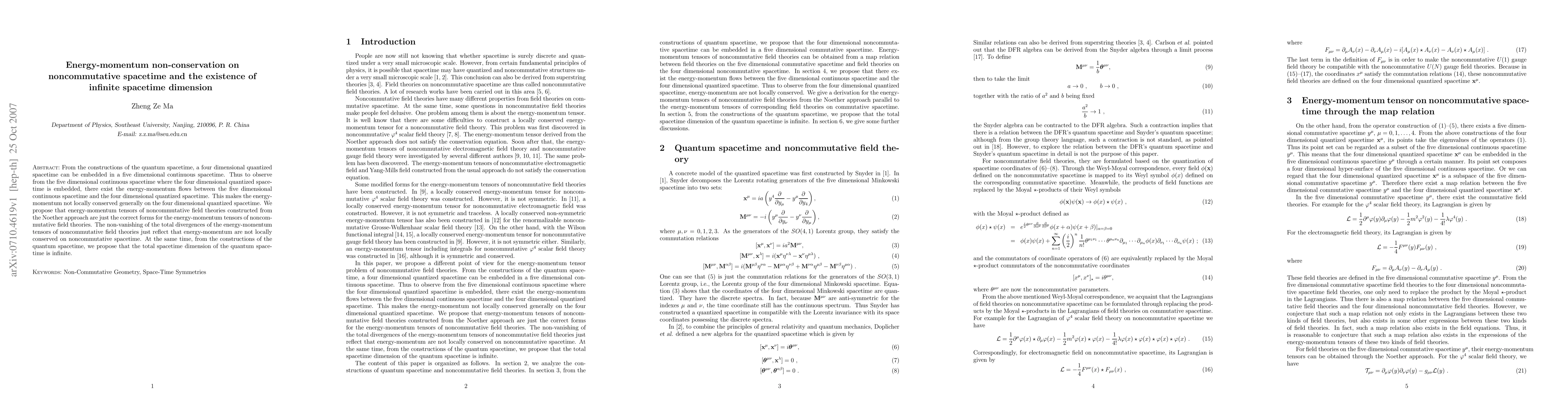 This paper explores energy-momentum non-conservation on noncommutative spacetime, proposing that a four-dimensional quantized spacetime is embedded in a five-dimensional continuous spacetime, leading to energy-momentum flows between them. It suggests that the non-vanishing total divergences of the energy-momentum tensors reflect this non-conservation and posits an infinite total spacetime dimension.