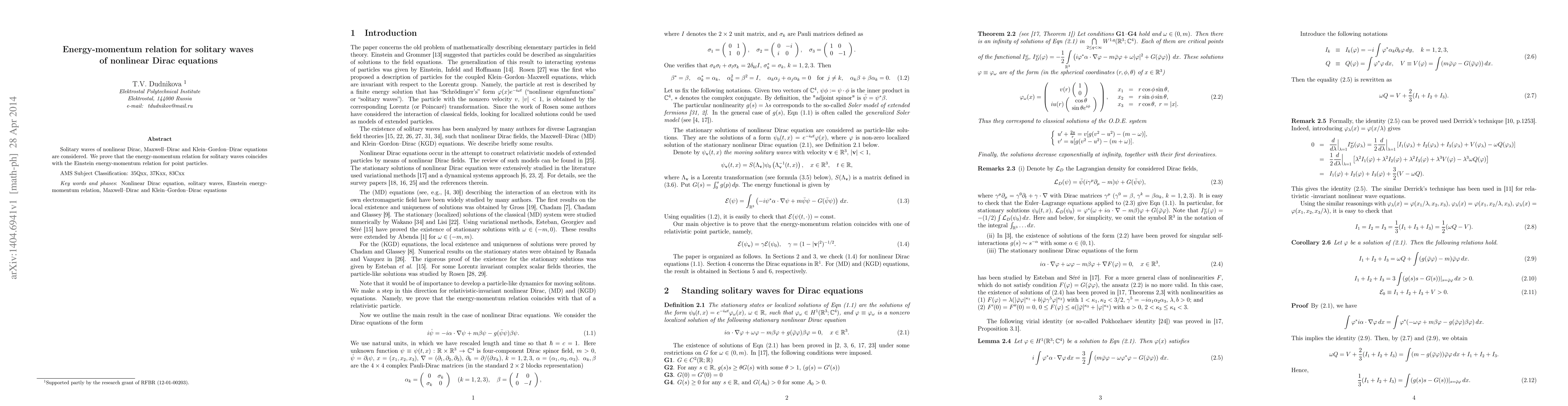 This paper investigates solitary waves in nonlinear Dirac, Maxwell-Dirac, and Klein-Gordon-Dirac equations, proving that their energy-momentum relation aligns with Einstein's relation for point particles. The findings highlight the deep connection between quantum field theory and relativistic mechanics.