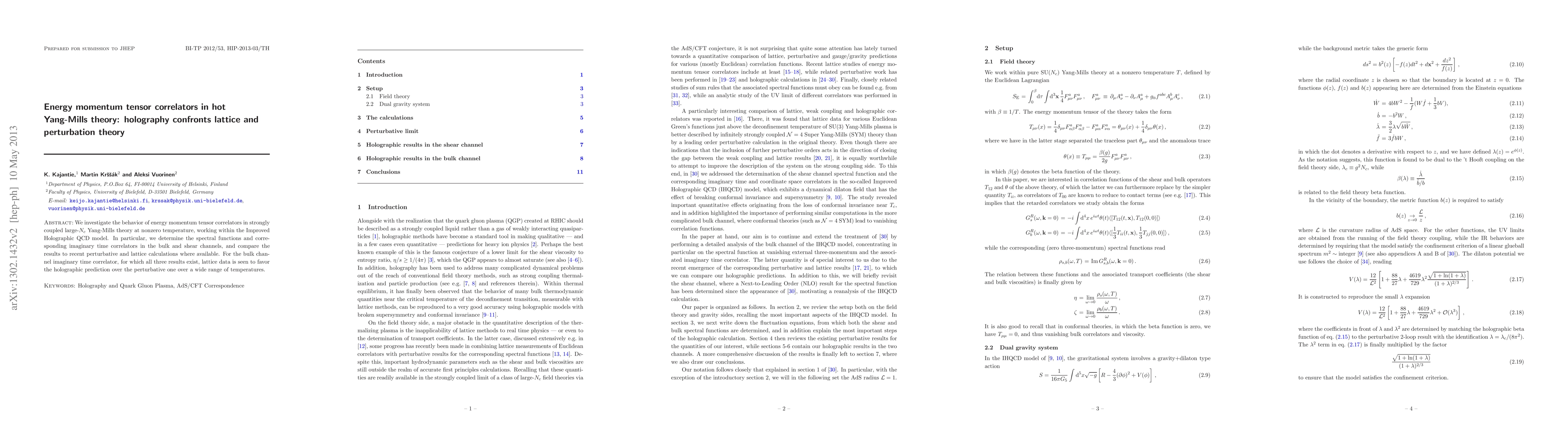 This paper examines energy momentum tensor correlators in hot Yang-Mills theory using the Improved Holographic QCD model, comparing its predictions to perturbative and lattice calculations. Holographic results for the bulk channel imaginary time correlator are found to better match lattice data than perturbative predictions across various temperatures.