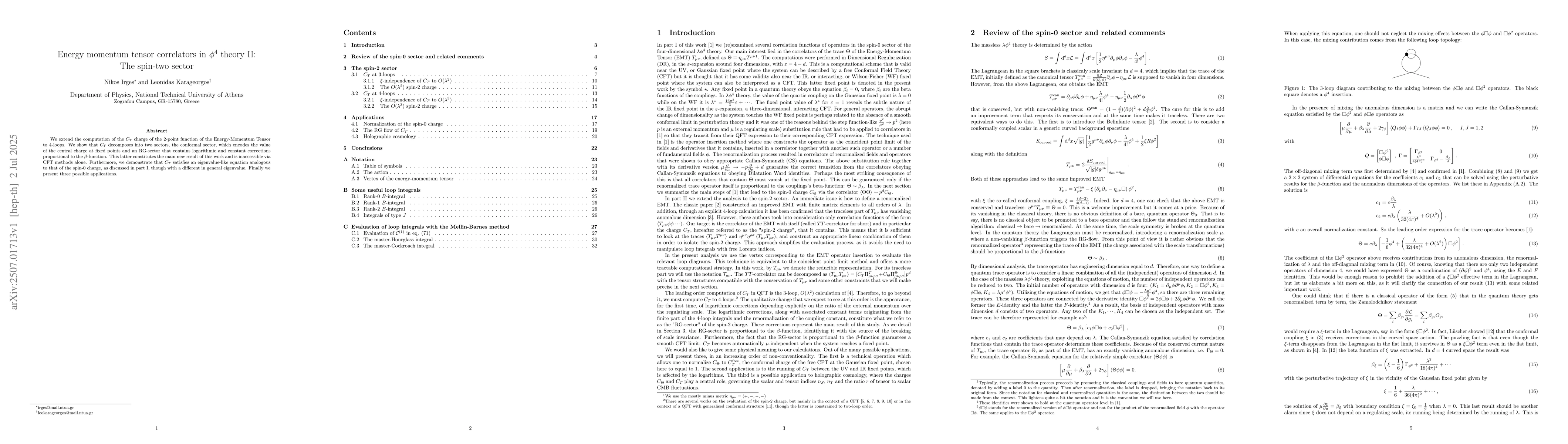 The paper extends the computation of the C_T charge for Energy-Momentum Tensor 2-point function correlators to 4-loops in φ^4 theory, revealing it decomposes into conformal and RG sectors. The RG sector, containing logarithmic and constant corrections tied to the beta-function, is a significant new finding, inaccessible through CFT methods alone. Additionally, C_T is shown to satisfy an eigenvalue-like equation, similar to the spin-0 charge, but with a distinct eigenvalue.