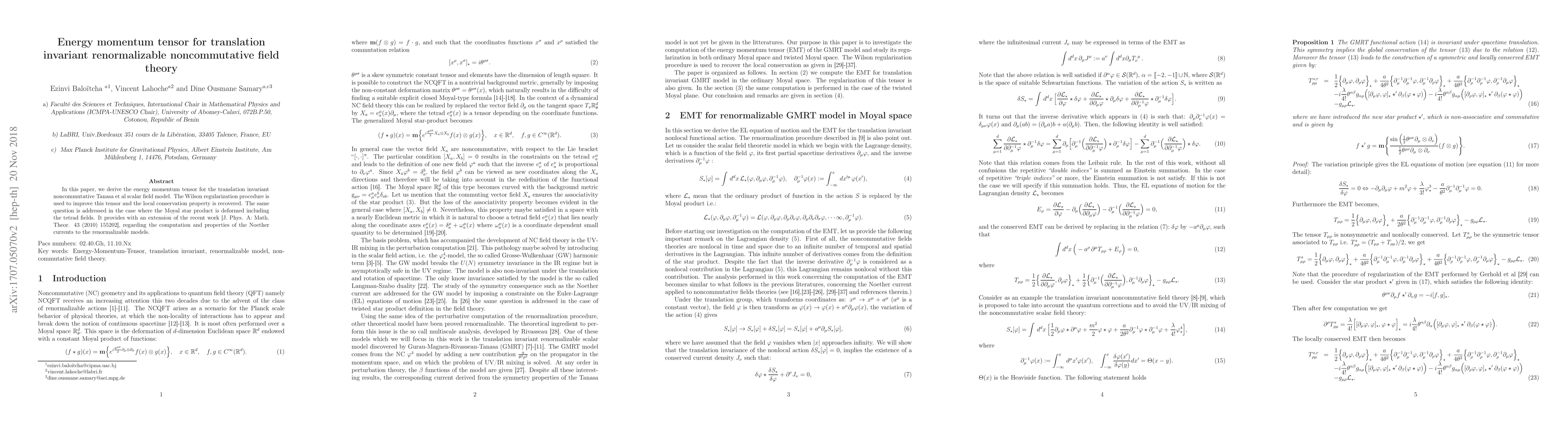 This paper derives the energy momentum tensor for a translation invariant noncommutative scalar field model using the Wilson regularization method, ensuring local conservation. It extends previous work by including tetrad fields and the Moyal star product deformation.
