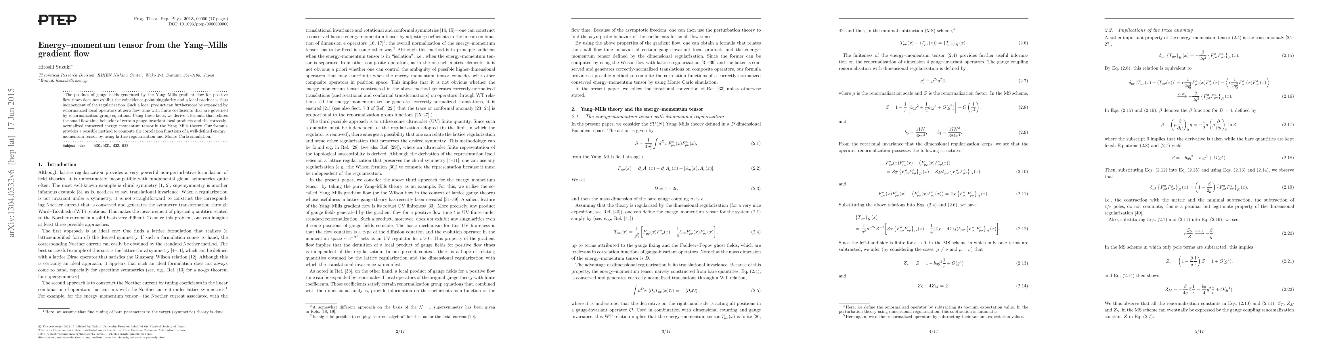 The paper derives a method to compute the conserved energy-momentum tensor in Yang-Mills theory using the Yang-Mills gradient flow, showing that local products are regularization-independent. It provides a formula linking the small flow-time behavior of gauge-invariant local products to the tensor, enabling lattice regularization and Monte Carlo simulations.