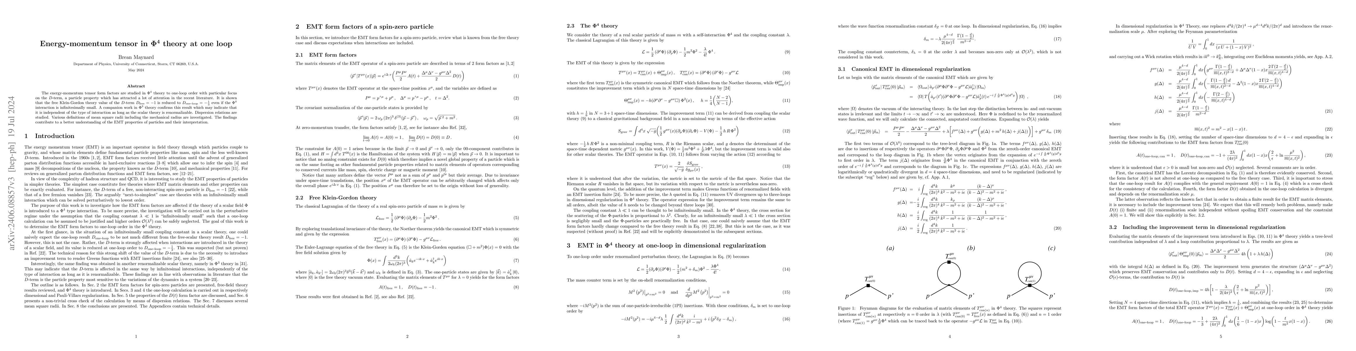 This paper examines the energy-momentum tensor form factors in $\Phi^4$ theory at one-loop level, particularly the $D$-term, which decreases from $D_{\text{free}}=-1$ to $D_{\text{one-loop}}=-\frac13$ due to interactions, suggesting this behavior may be independent of interaction type in renormalizable scalar theories. The study also explores dispersion relations and various mean square radii definitions.