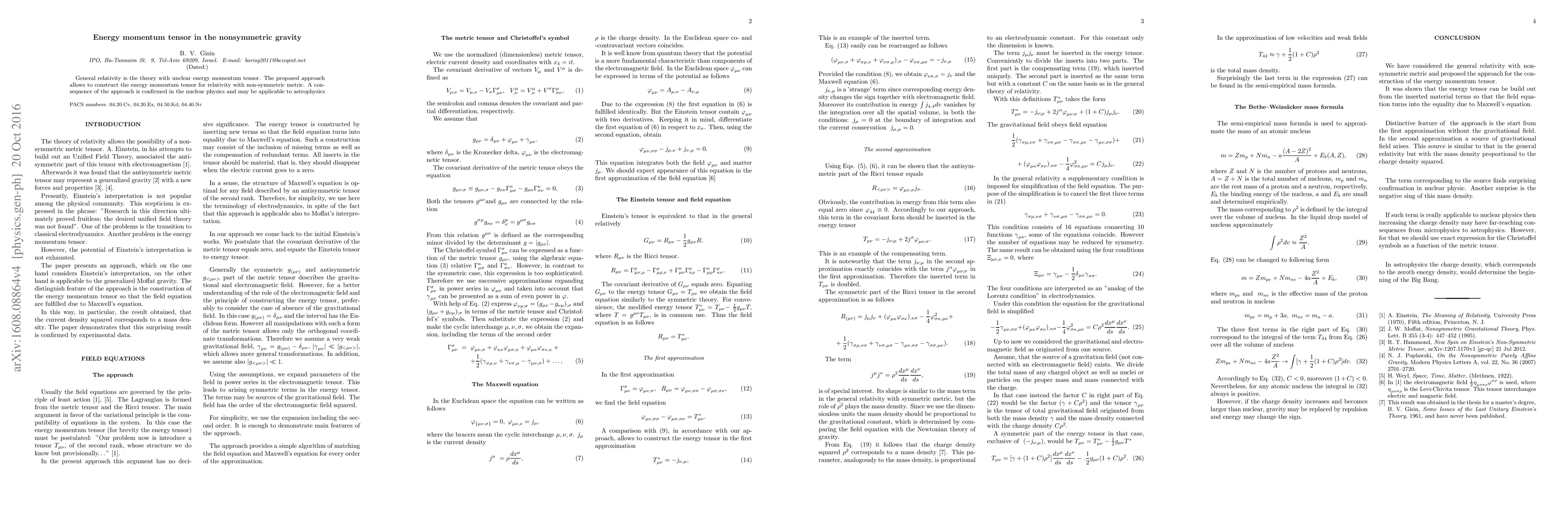 This paper proposes a method to construct an energy momentum tensor for nonsymmetric gravity, addressing the ambiguity in general relativity's tensor. The approach is validated through its implications in nuclear physics.
