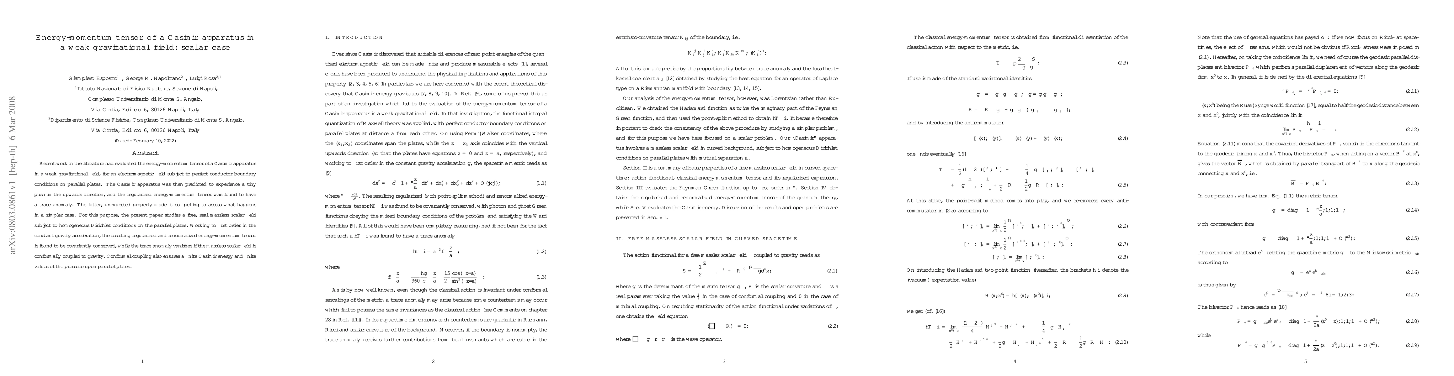 This paper investigates the energy-momentum tensor of a Casimir apparatus in a weak gravitational field for a scalar field with Dirichlet boundary conditions. It finds that the tensor is covariantly conserved and the trace anomaly vanishes when the scalar field is conformally coupled to gravity, ensuring finite Casimir energy and pressure.