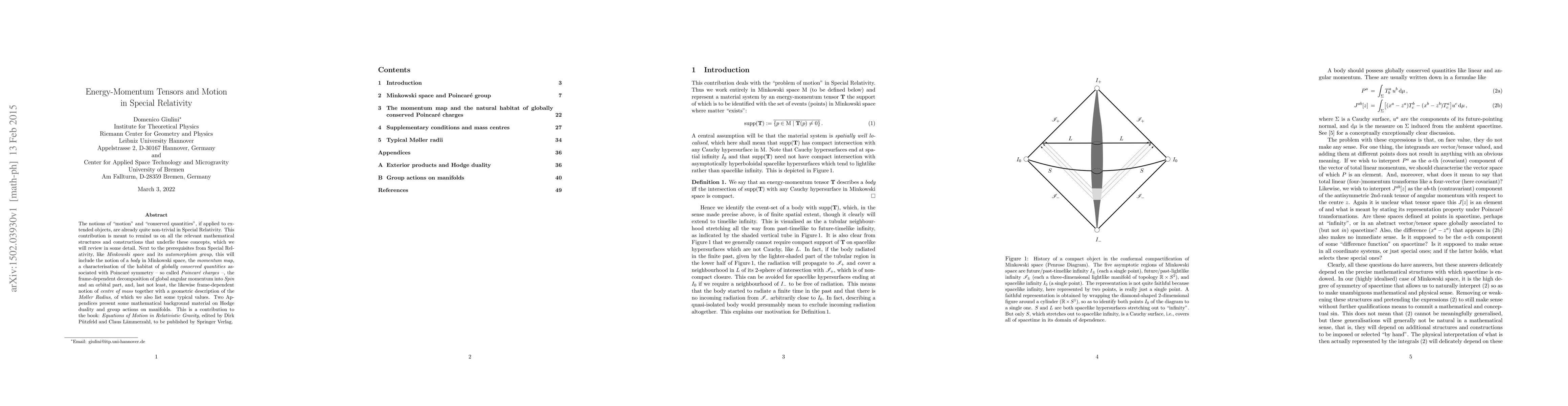 The notions of "motion" and "conserved quantities", if applied to extended objects, are already quite non-trivial in Special Relativity. This contribution is meant to remind us on all the relevant mathematical structures and constructions that underlie these concepts, which we will review in some detail. Next to the prerequisites from Special Relativity, like Minkowski space and its automorphism group, this will include the notion of a body in Minkowski space, the momentum map, a characterisation of the habitat of globally conserved quantities associated with Poincar\'e symmetry -- so called Poincar\'e charges --, the frame-dependent decomposition of global angular momentum into Spin and an orbital part, and, last not least, the likewise frame-dependent notion of centre of mass together with a geometric description of the Moeller Radius, of which we also list some typical values. Two Appendices present some mathematical background material on Hodge duality and group actions on manifolds. This is a contribution to the book: "Equations of Motion in Relativistic Gravity", edited by Dirk Puetzfeld and Claus Laemmerzahl, to be published by Springer Verlag.
