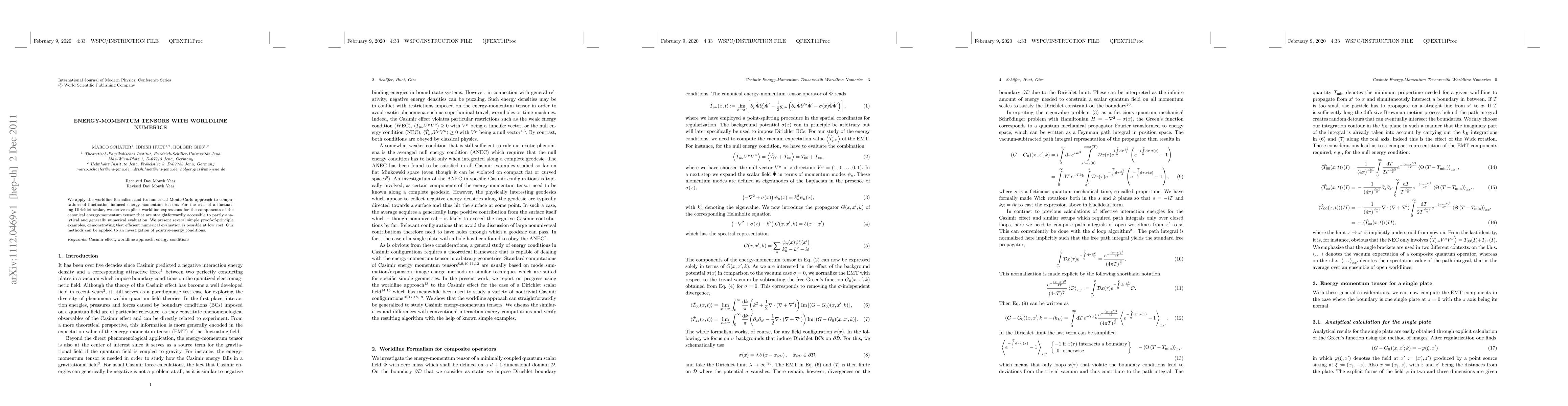 This paper utilizes the worldline formalism and Monte-Carlo simulations to compute energy-momentum tensors for fluctuating Dirichlet scalars, providing explicit expressions and demonstrating efficient, low-cost numerical evaluation. The methods are shown to be applicable for investigating positive-energy conditions.