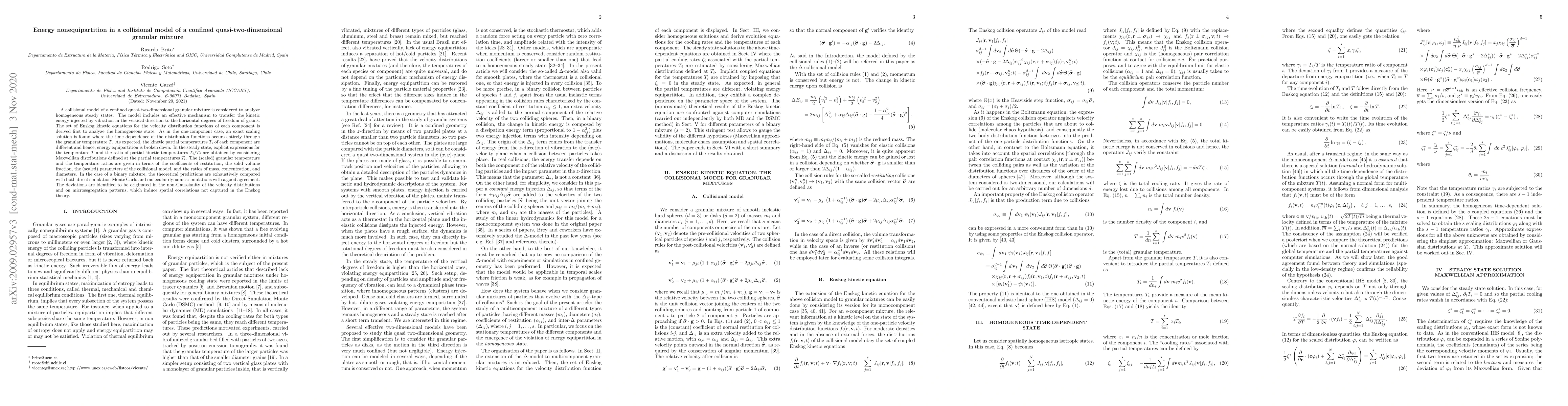 This paper investigates the energy distribution in a confined quasi-two-dimensional granular mixture using a collisional model, revealing that energy equipartition is broken due to differing kinetic partial temperatures. Theoretical predictions for granular temperature and temperature ratios are validated against simulations, showing deviations attributed to non-Gaussian velocity distributions and spatial correlations.