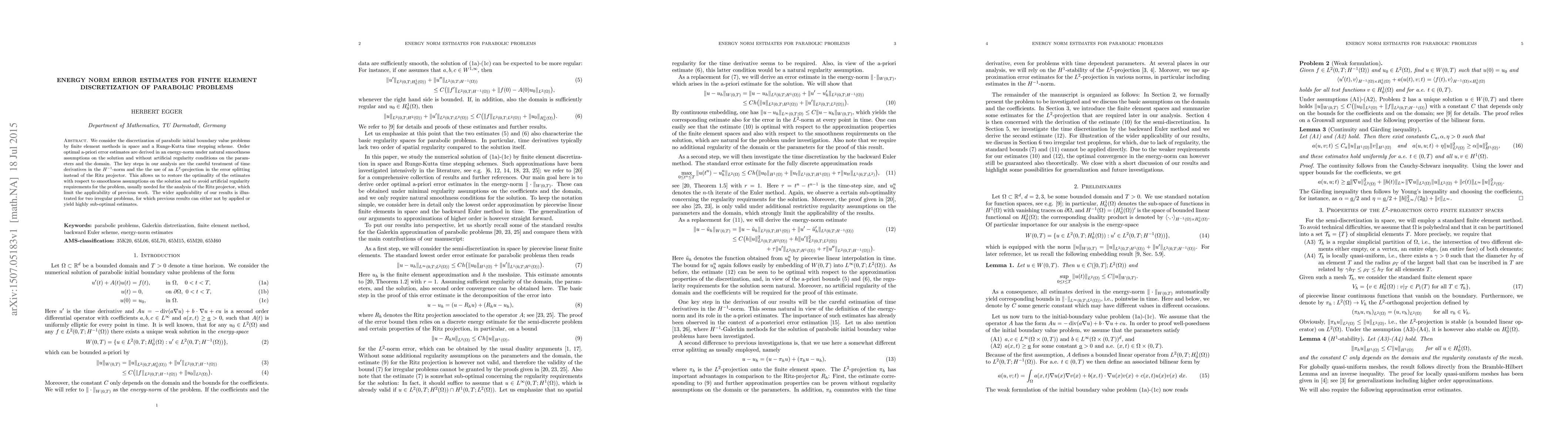 This paper derives optimal a-priori error estimates for finite element discretization of parabolic problems using a Runge-Kutta time scheme, focusing on the energy-norm. The analysis avoids artificial regularity conditions and utilizes an L2-projection, enhancing the applicability to irregular problems.