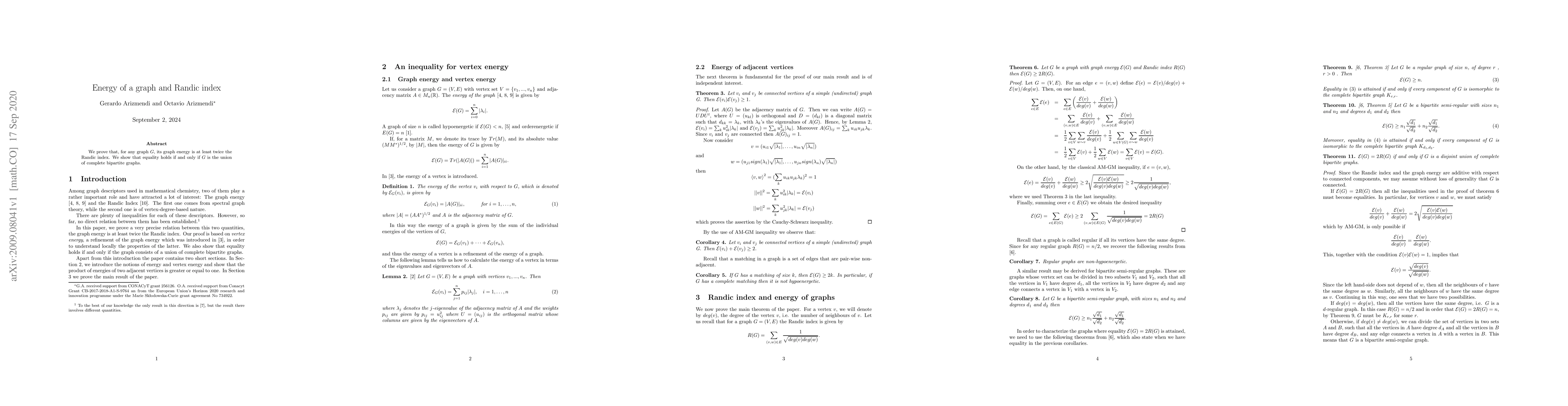 Summary: The paper proves that the graph energy of any graph $G$ is at least twice its Randic index, with equality occurring if and only if $G$ is composed solely of complete bipartite graphs. This establishes a significant relationship between these two graph theoretical measures.