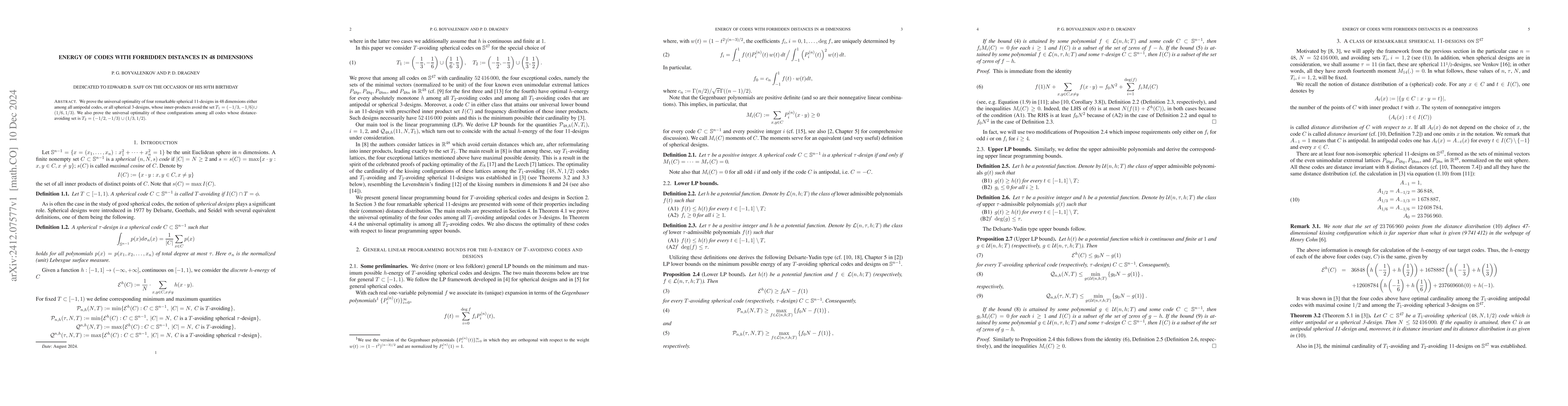 This paper establishes the universal optimality of four spherical 11-designs in 48 dimensions, proving their superiority among antipodal codes and spherical 3-designs with specific forbidden inner-product distances. It also confirms their optimality among codes avoiding another set of distance values.