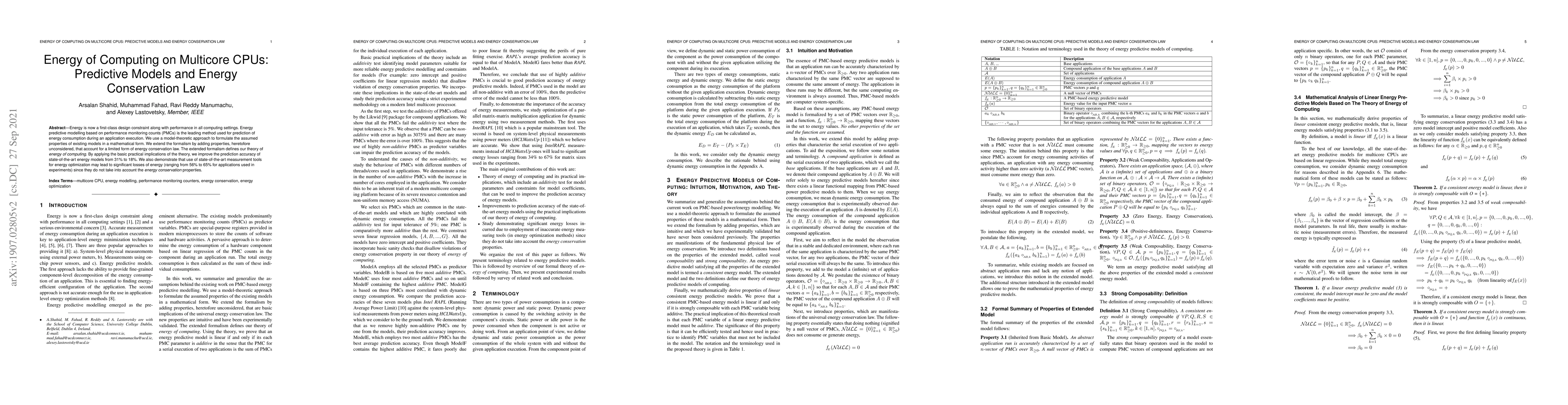 Energy is now a first-class design constraint along with performance in all computing settings. Energy predictive modelling based on performance monitoring counts (PMCs) is the leading method used for prediction of energy consumption during an application execution. We use a model-theoretic approach to formulate the assumed properties of existing models in a mathematical form. We extend the formalism by adding properties, heretofore unconsidered, that account for a limited form of energy conservation law. The extended formalism defines our theory of energy of computing. By applying the basic practical implications of the theory, we improve the prediction accuracy of state-of-the-art energy models from 31% to 18%. We also demonstrate that use of state-of-the-art measurement tools for energy optimisation may lead to significant losses of energy (ranging from 56% to 65% for applications used in experiments) since they do not take into account the energy conservation properties.
